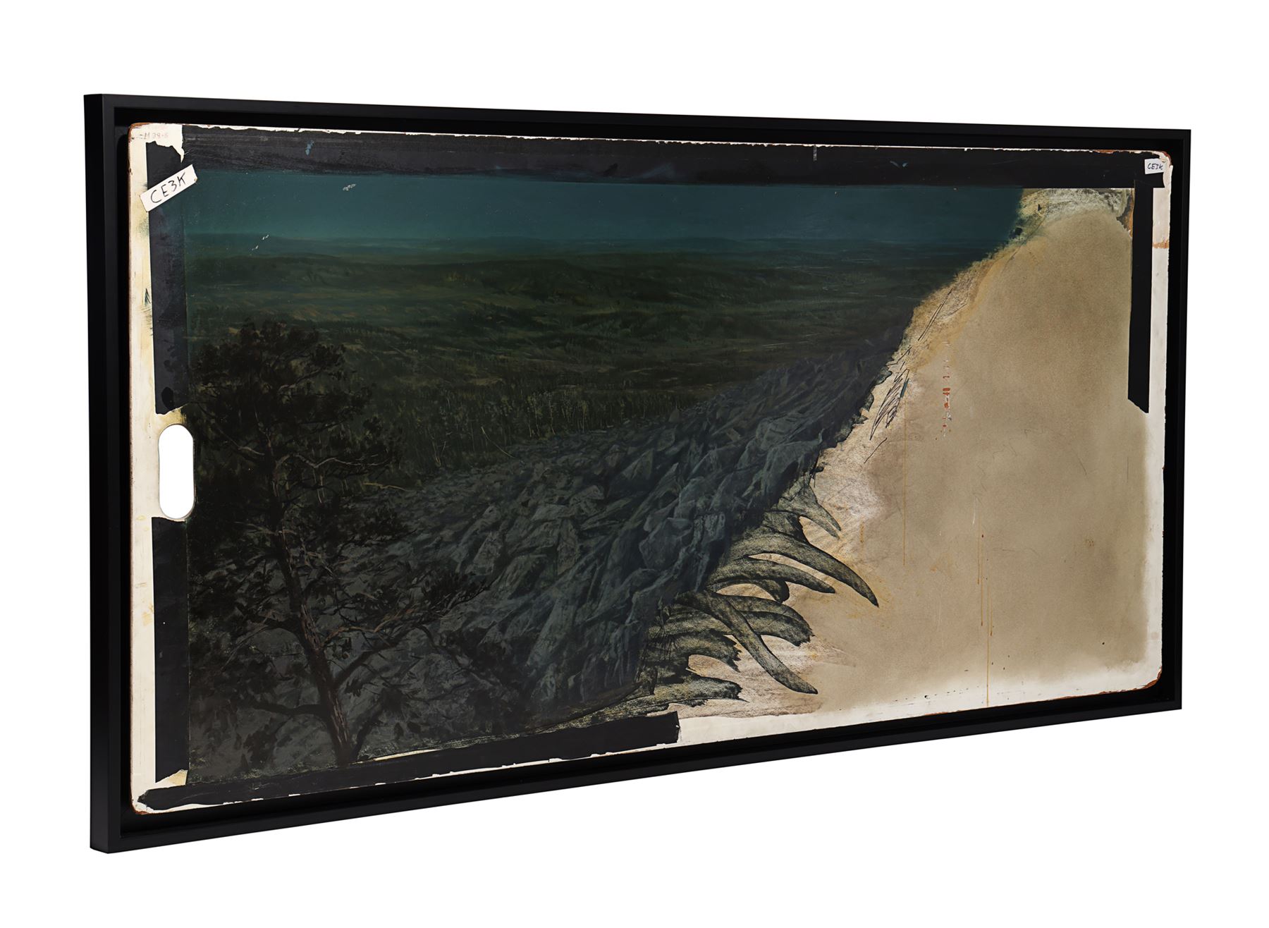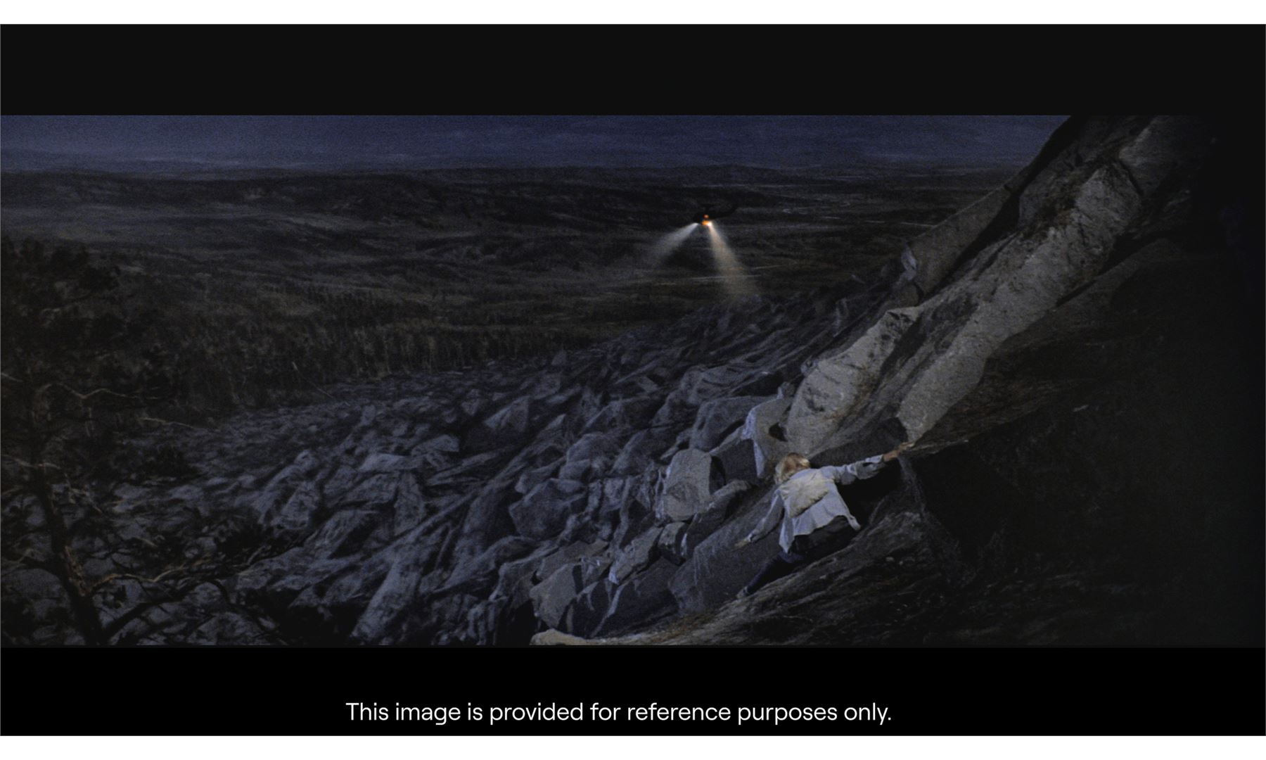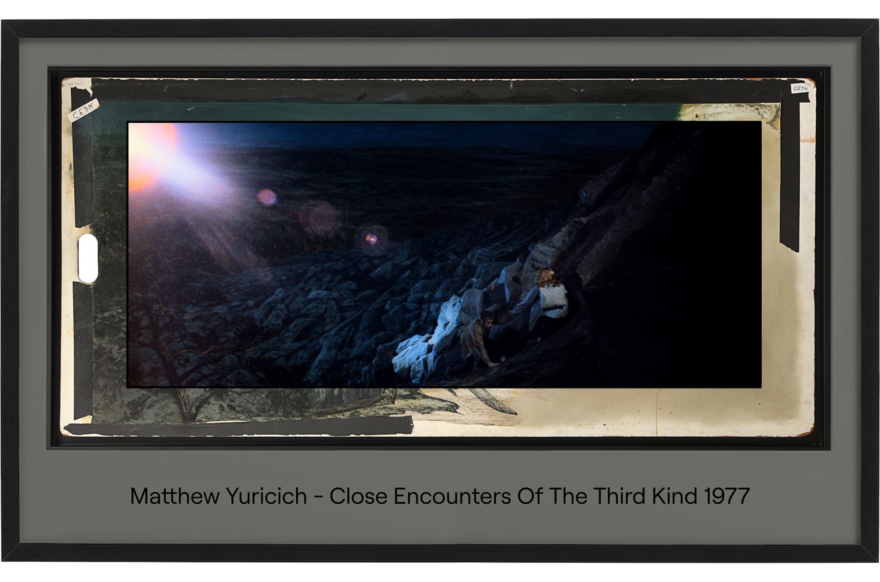 CLOSE ENCOUNTERS OF THE THIRD KIND (1977) - Hand-Painted Matthew Yuricich Devils Tower Matte Painting - A hand-painted Matthew Yuricich Mothership Top finale landing matte painting from Steven Spielberg's sci-fi classic Close Encounters of the Third Kind. This matte painting was used for the scene where Roy (Richard Dreyfuss) and Jillian (Melinda Dillon) climb Devils Tower to see the UFOs. The film was nominated for eight Academy Awards, winning one and also winning a Special Achievement award for Sound Effects Editing.