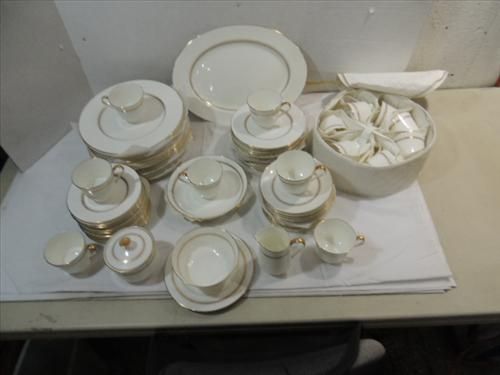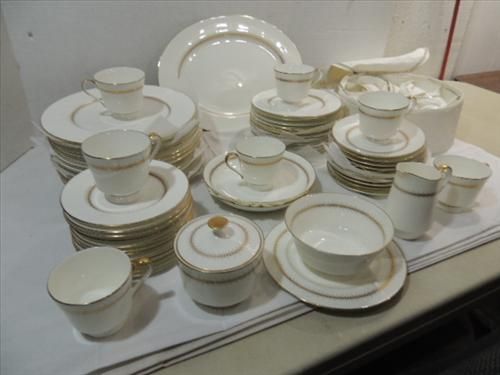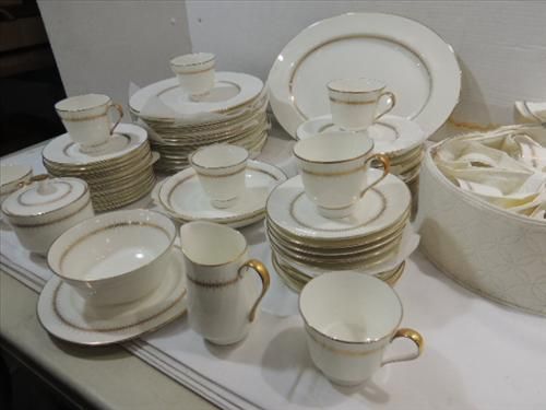 64 PCS VINTAGE MIKASA NARUMI BONE CHINA DINNER SET. 1 PLATTER, 1 CREAMER, 1 SUGAR BOWL & LID, GRAVY BOWL, 12 COFFEE CUPS, 10 SAUCERS, 12 DESSERT PLATES, 12 SALAD PLATES, 12 DINNER PLATES AAND 2 SERVING BOWLS. AS SHOWN. VIEW PICTURE FOR DETAIL.