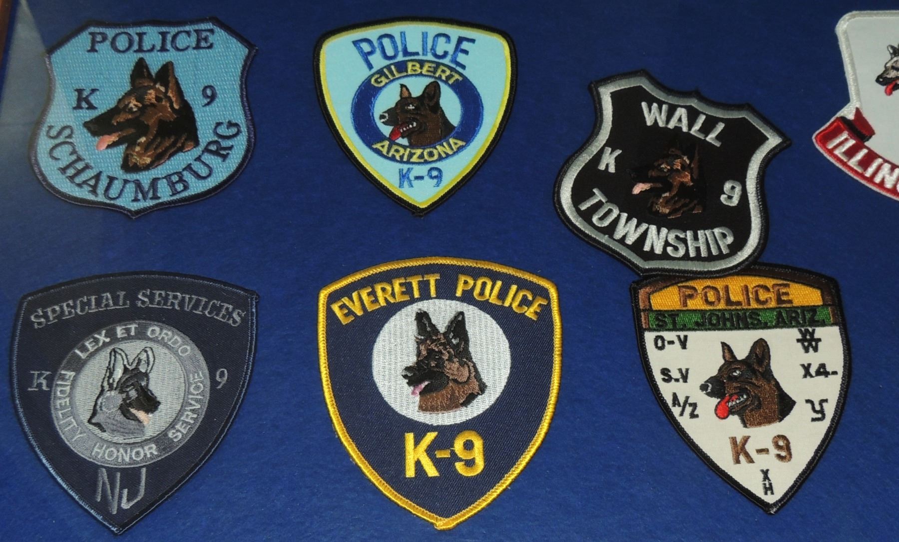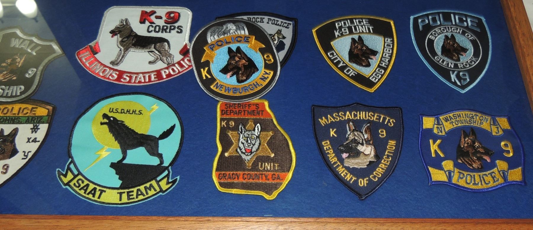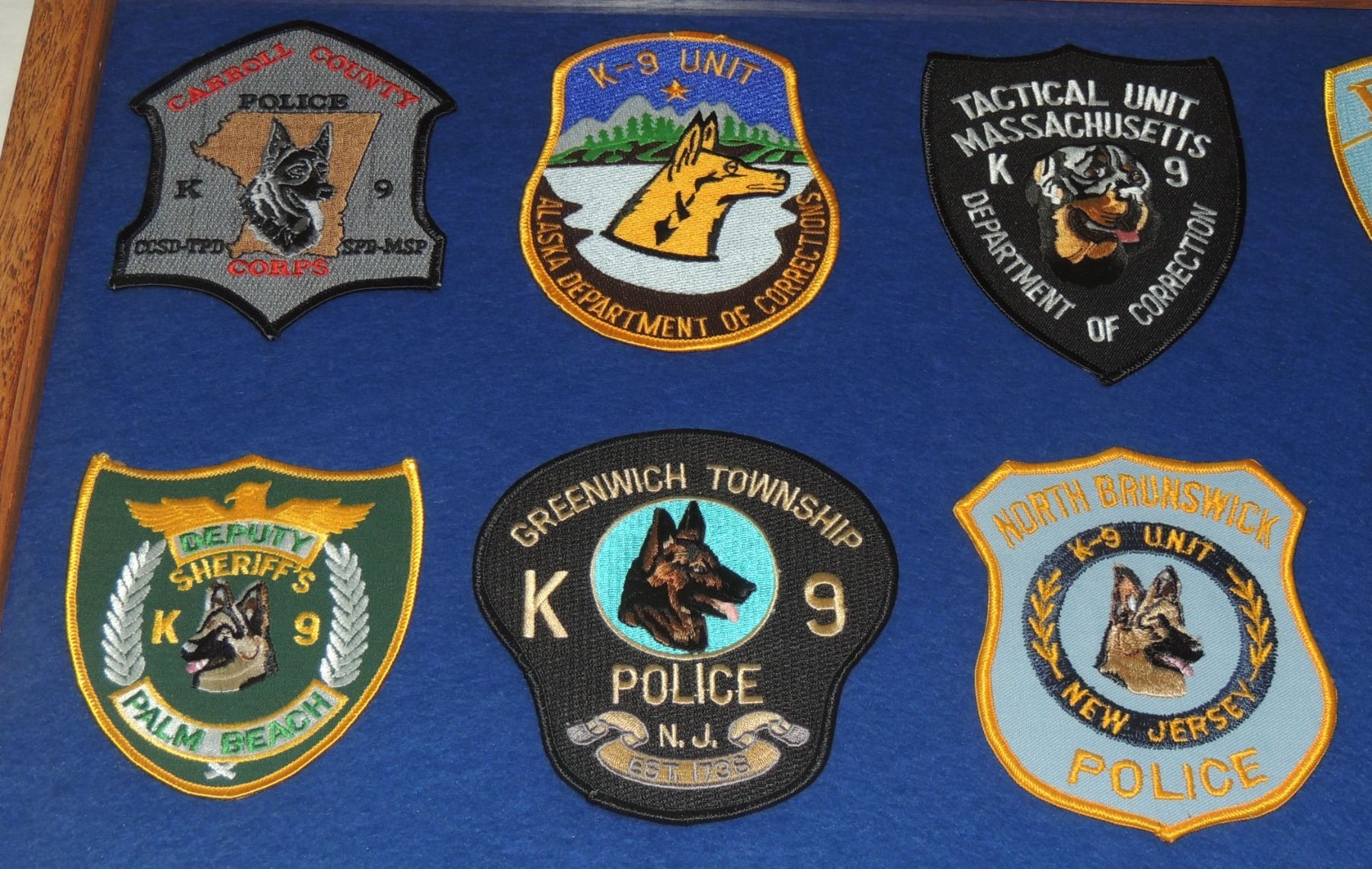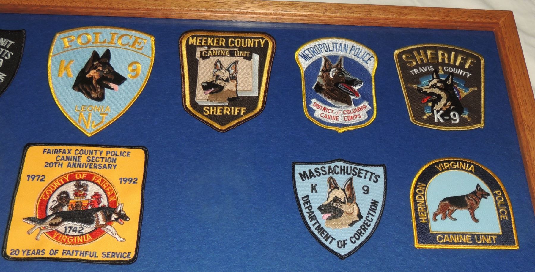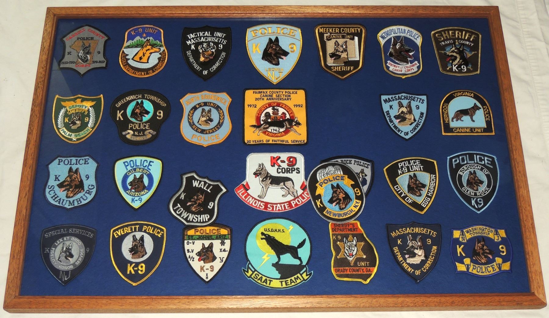 28 FRAMED PATCHES 2 LOOSE CANINE K-9 DOG POLICE UNITED STATES OF AMERICA USA LAW ENFORCEMENT INC. ALASKA TACTICAL UNIT NEW JERSEY ILLINOIS U.S.D.H.H.S. SAAT TEAM 25 X 37 INCHES IN SIZE