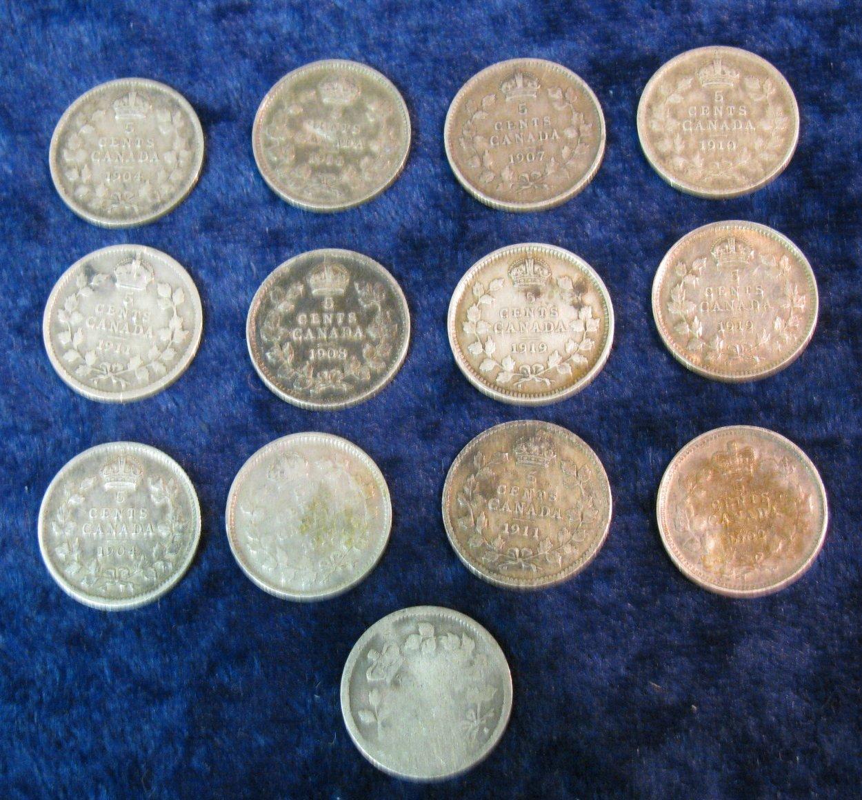 641. (13) 1874H-1919 Canada Five Cent Silvers.