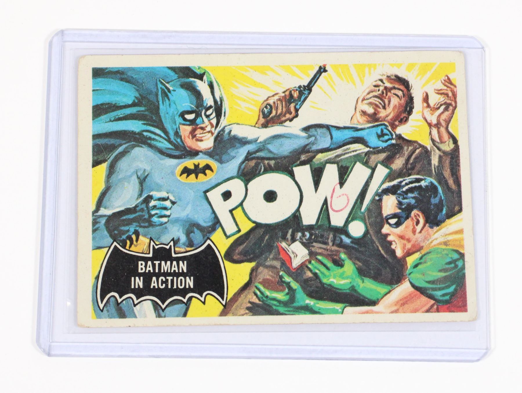 BATMAN IN ACTION CANADIAN O-PEE-CHEE VARIATION OF TOPPS CARD, WORN CONDITION- INCLUDES PLASTIC PROTECTIVE SLEEVE AND ADDITIONAL SLEEVE. 1966 BATMAN CARD THE BATMAN