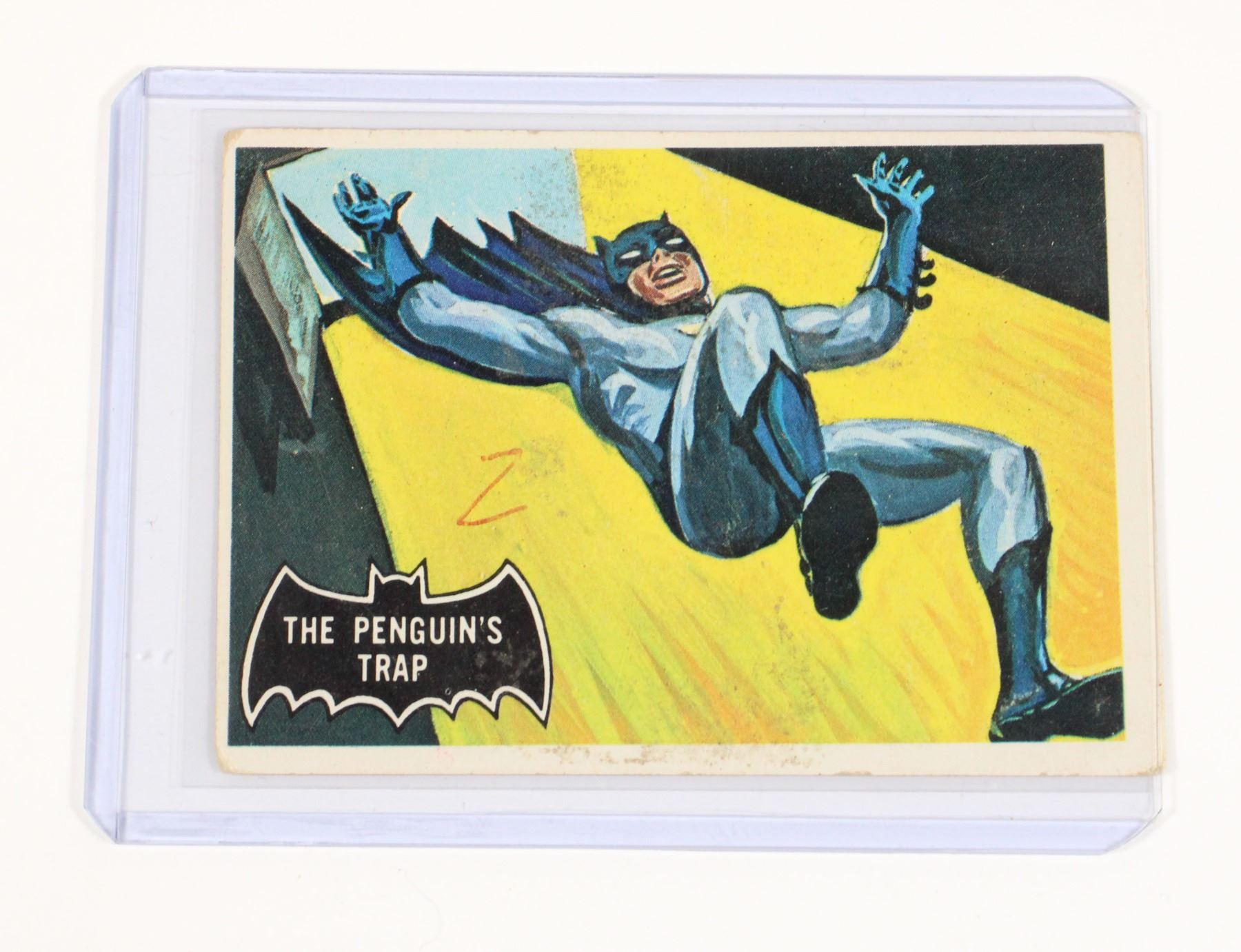 THE PENGUIN'S TRAPCANADIAN O-PEE-CHEE VARIATION OF TOPPS CARD, WORN CONDITION- INCLUDES PLASTIC PROTECTIVE SLEEVE AND ADDITIONAL SLEEVE. 1966 BATMAN CARD THE BATMAN