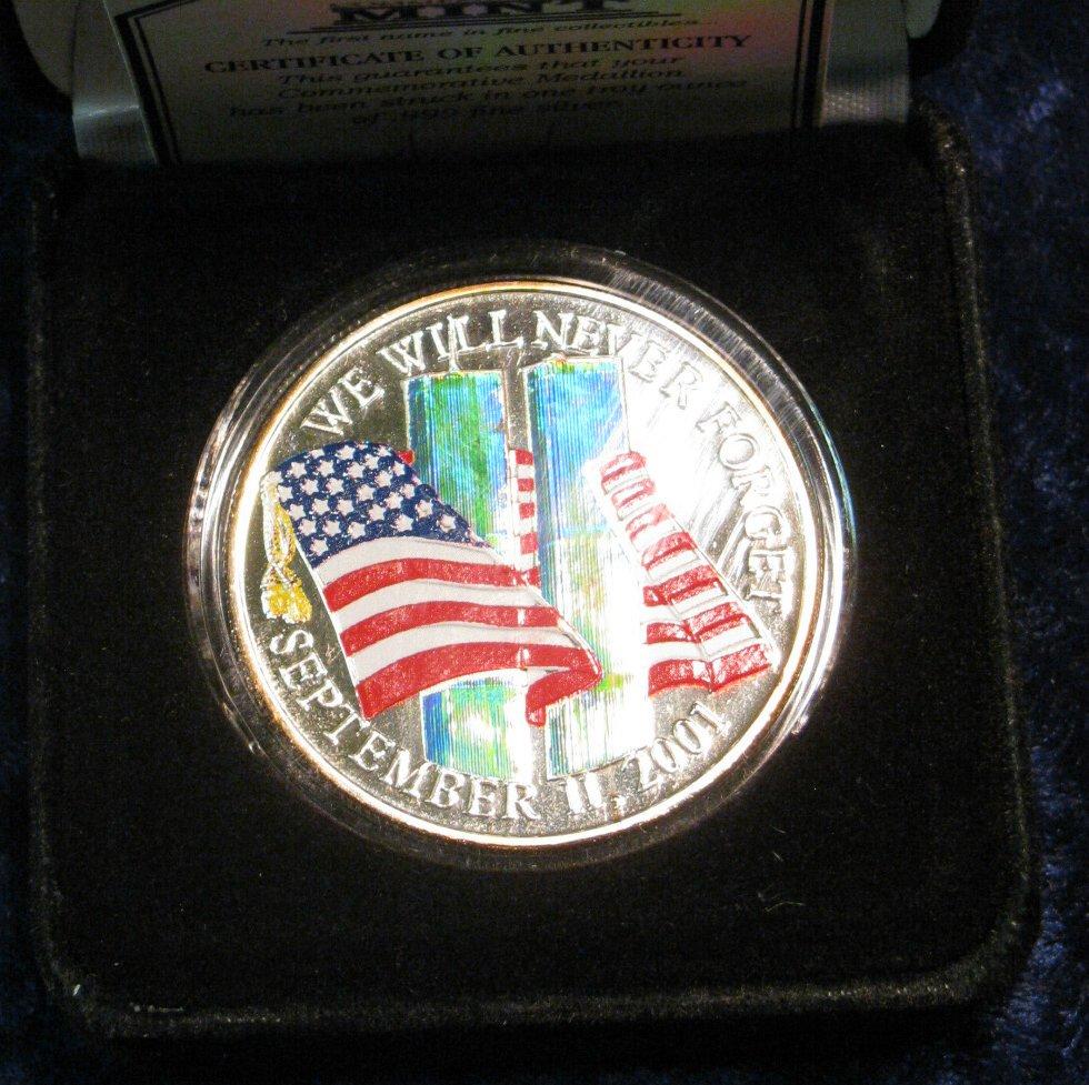 644. September 11, 2001 Colorized with Hologram .999 Fine Silver World Trade Center One Ounce in a velvet-lined case.