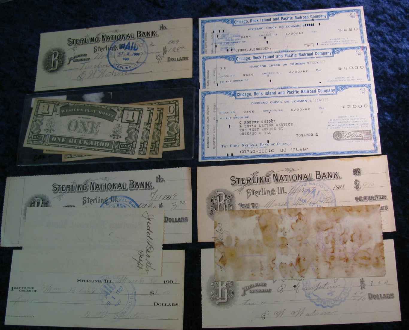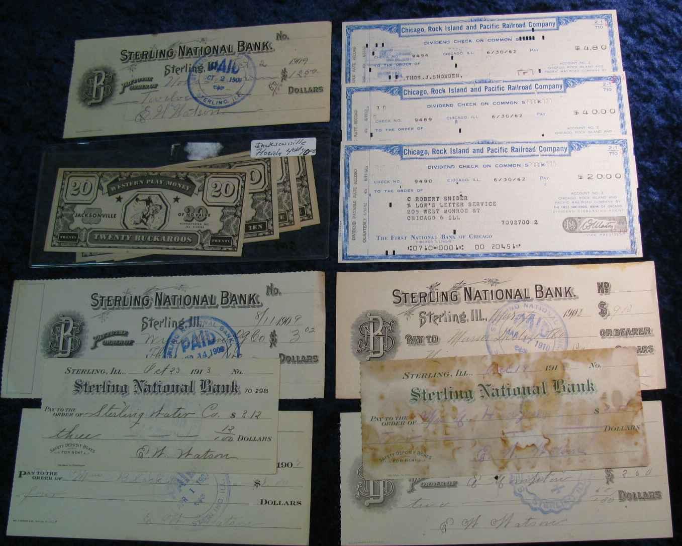 644. Set of Jacksonville, Florida Western Play Money Notes; several early 1900 Sterling National Bank Checks from Sterling, Ill.; & several Chicago, Rock Island, & Pacific Railroad Company Checks.