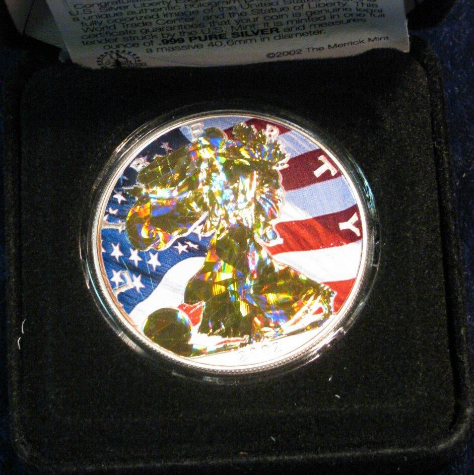 645. 2002 U.S. Silver Eagle Dollar Hologram Edition with special Colorized image of the U.S. Flag. .999 Fine Silver One Ounce in a special velvet-lined box with certificate of authenticity.