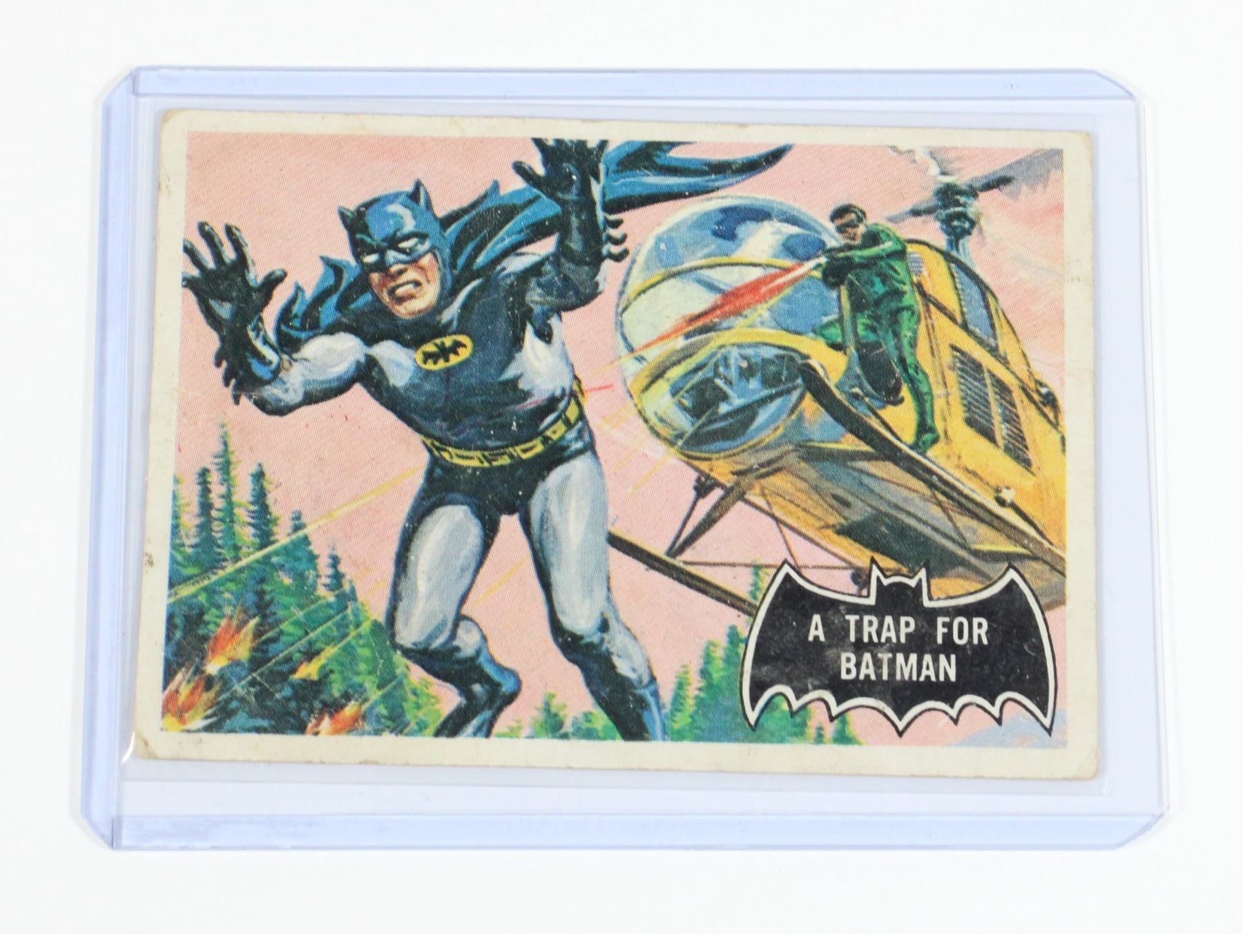 A TRAP FOR BATMAN CANADIAN O-PEE-CHEE VARIATION OF TOPPS CARD, WORN CONDITION- INCLUDES PLASTIC PROTECTIVE SLEEVE AND ADDITIONAL SLEEVE. 1966 BATMAN CARD THE BATMAN