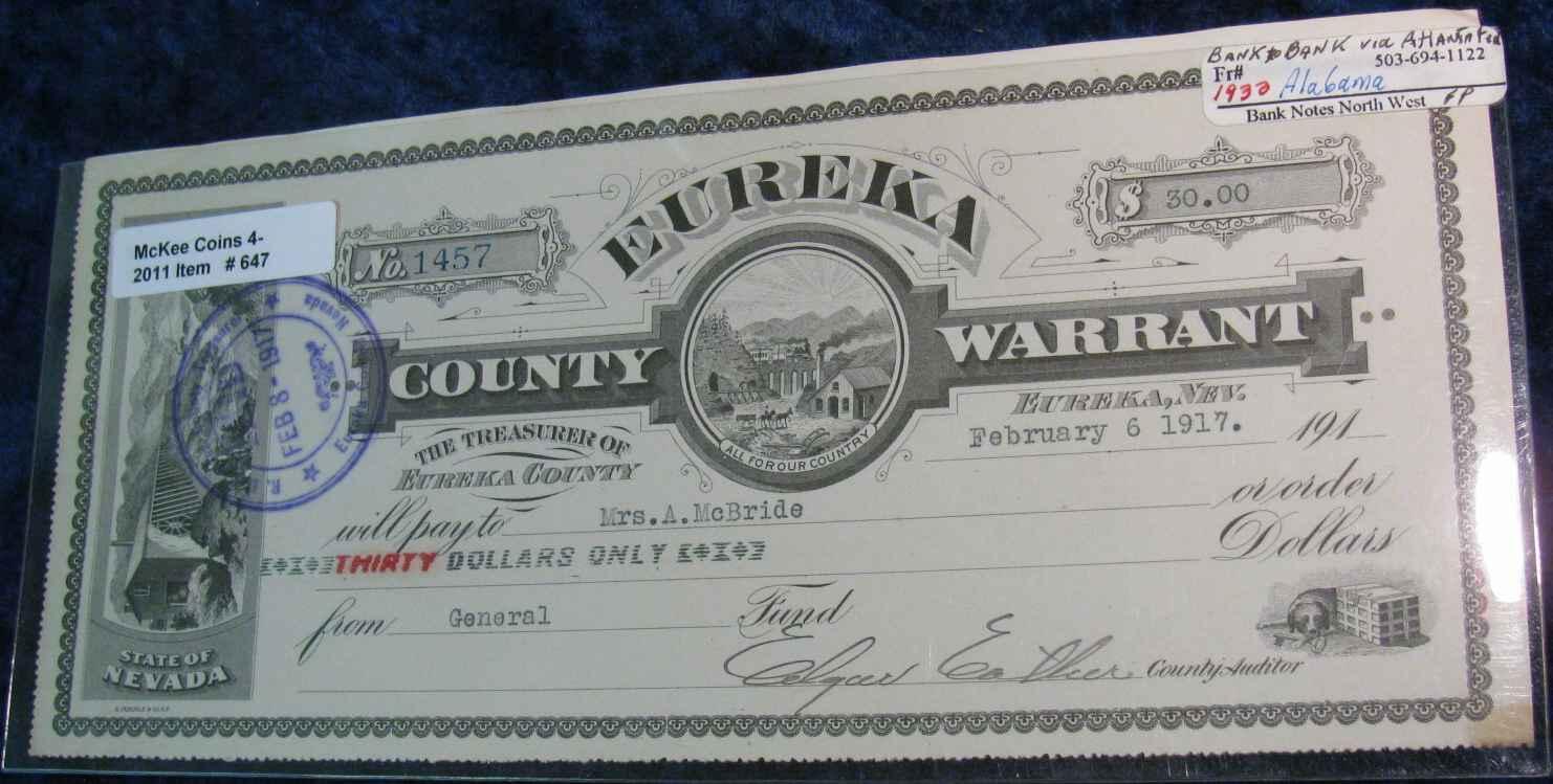647. 1917 $30 Eureka County Warrant, Eureka, Nevada with lithographs.