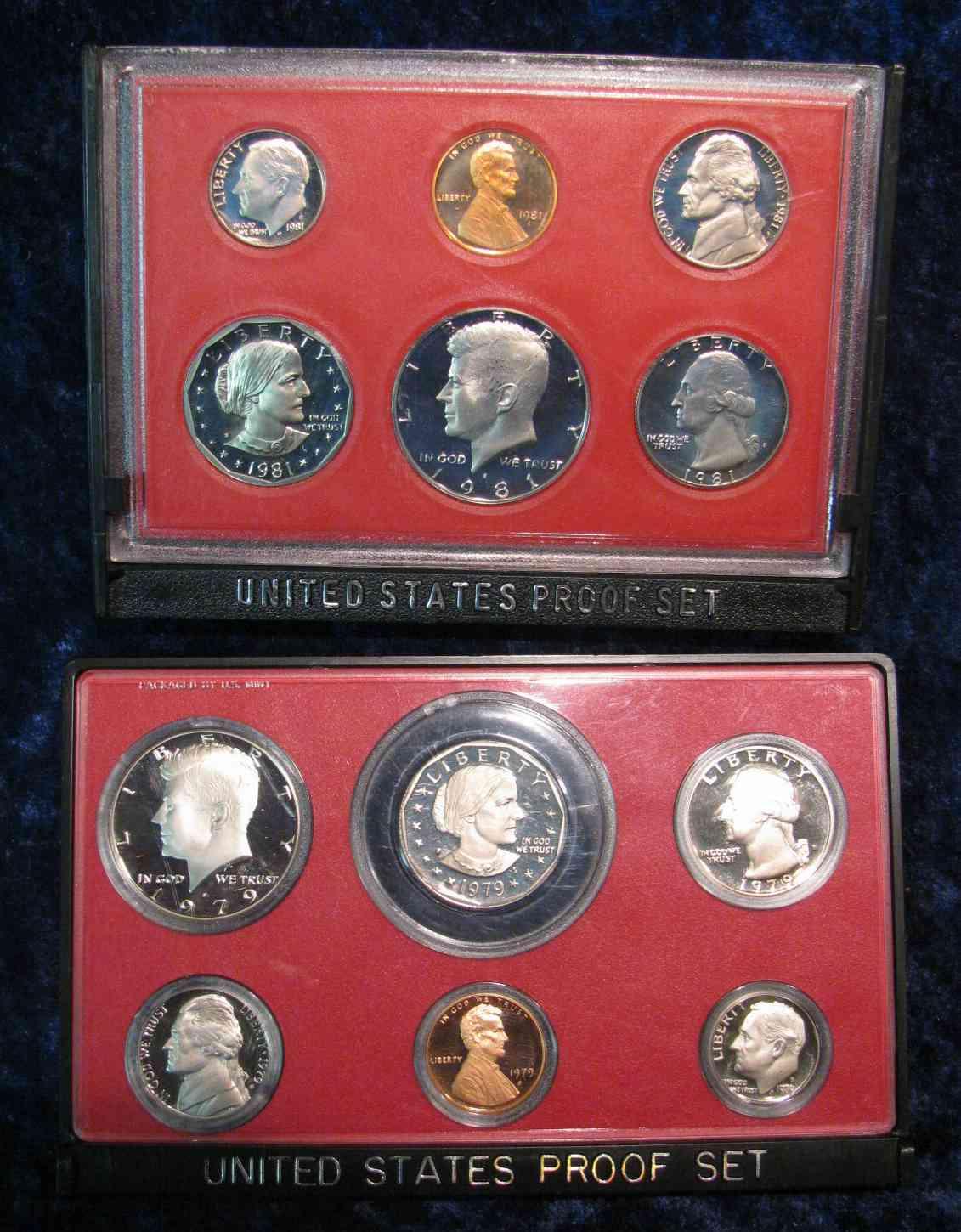 647. 1979 S & 81 S U.S. Proof Sets. No lids on cases. Each contains cent through dollar.