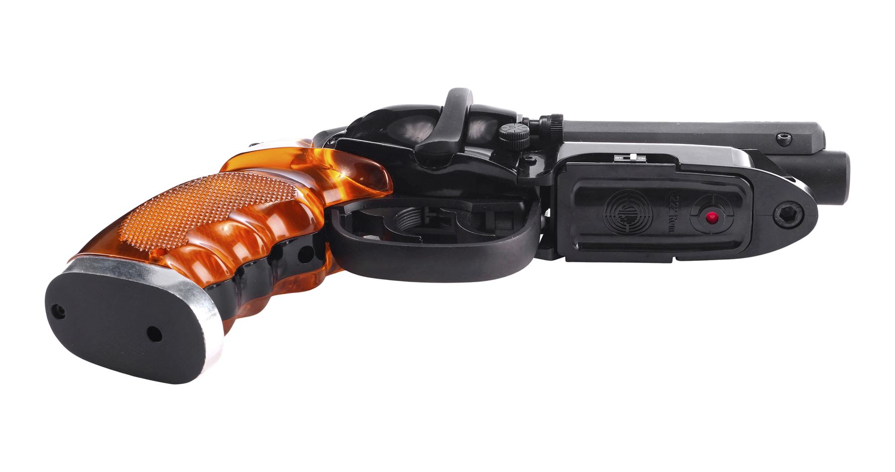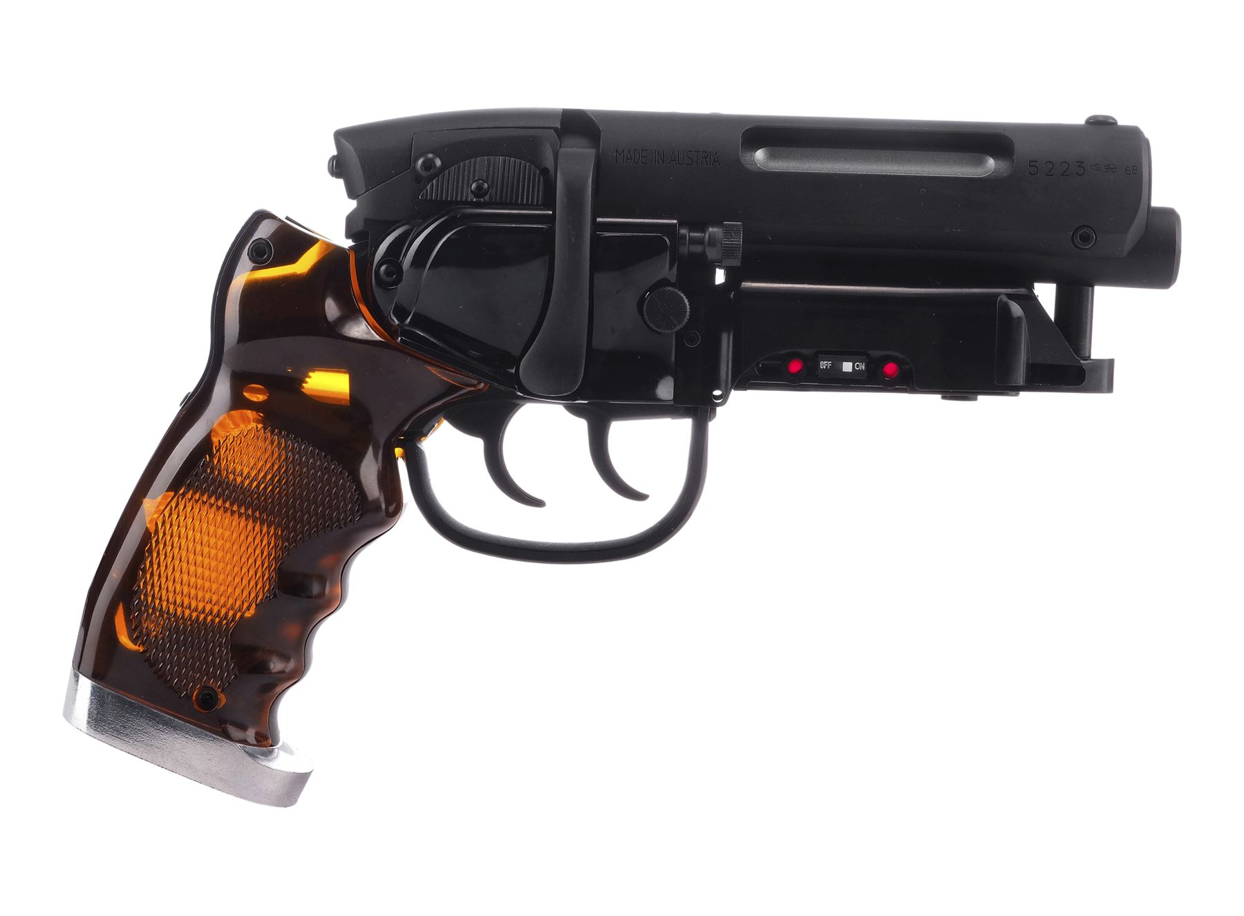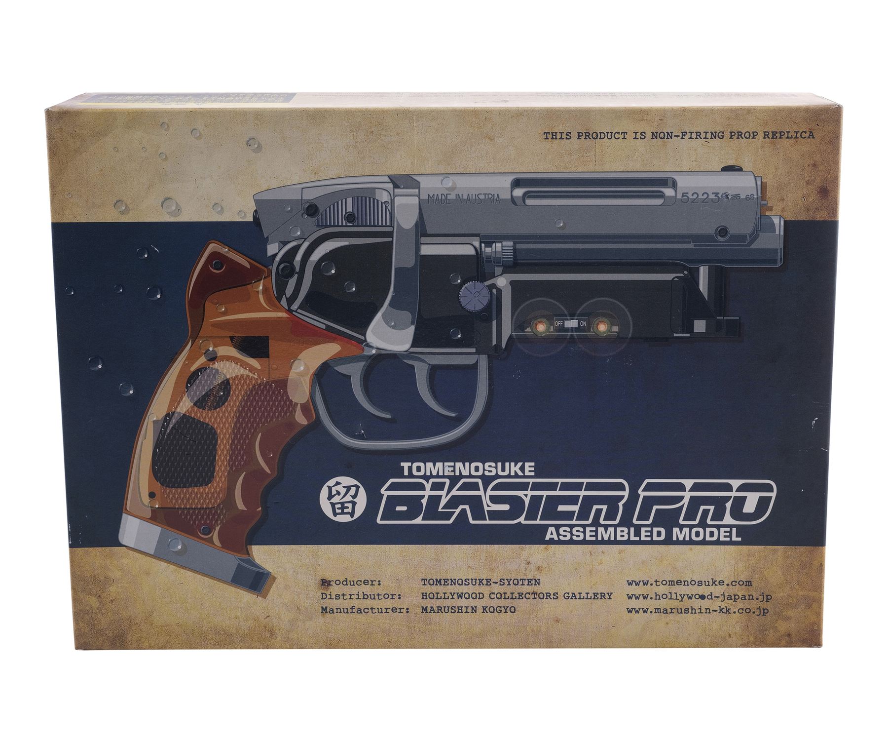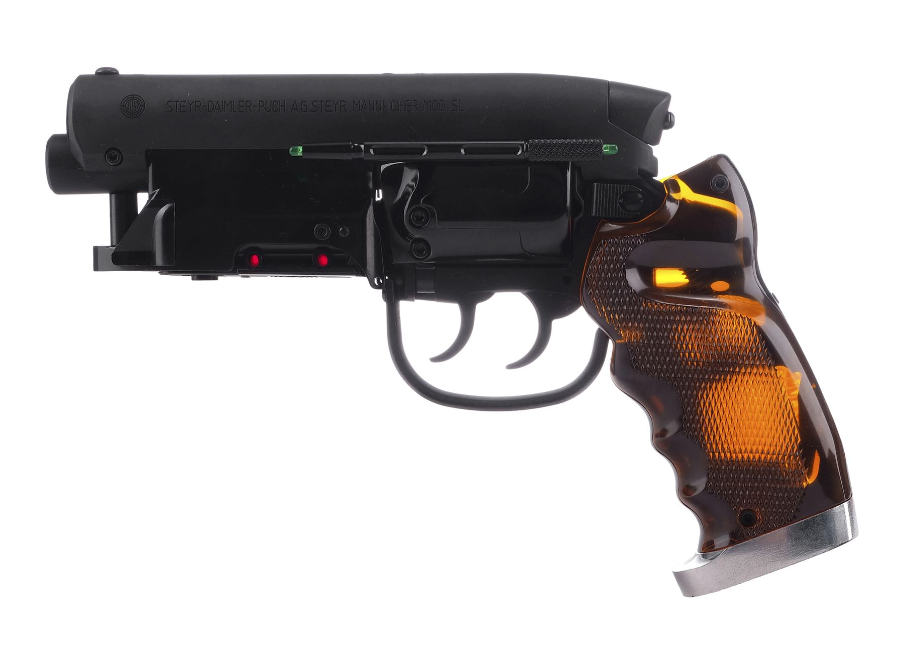 This two-triggered blaster replica was created by Japanese toy designer Tomenosuke based on production originals. Made from machined aluminum and high-density polymers, it features LED lights inside the textured amber-hued grip, under the muzzle, and along the barrel and illuminate via a switch on the right side. The right side of the barrel is engraved with serial number "522368," while the Steyr-Daimler-Puch logo is engraved on the left side. Included is the original padded Tomenosuke box and Japanese-language instructions booklet still in its plastic sleeve. The box exhibits minor creasing and bending from being opened. Dimensions: 12.25" x 8.75" x 2.5" (31.25 cm x 22.25 cm x 6.5 cm)
