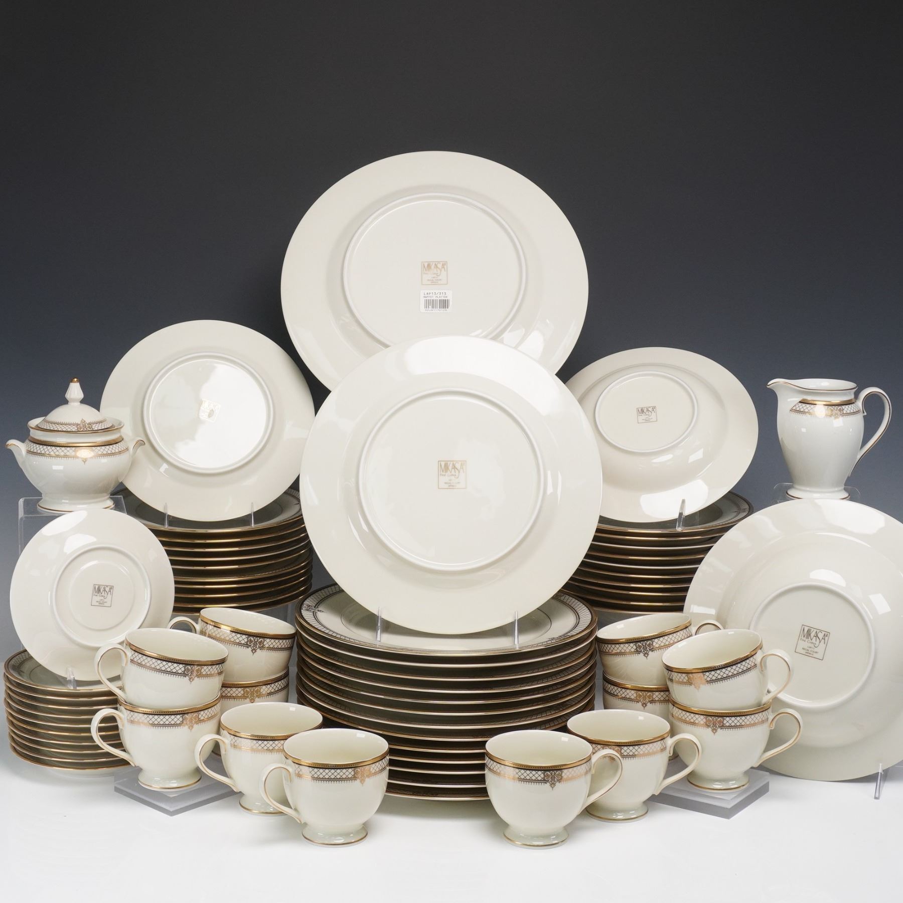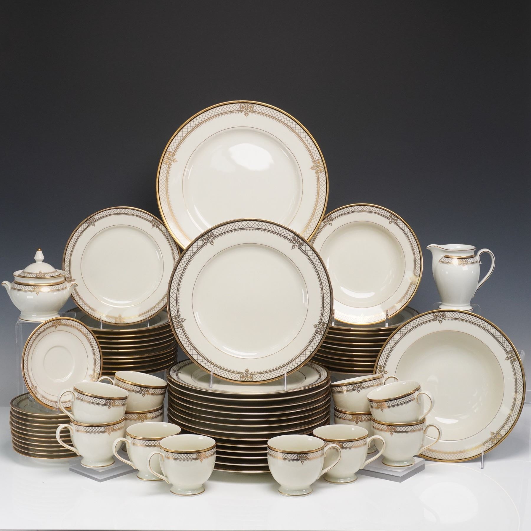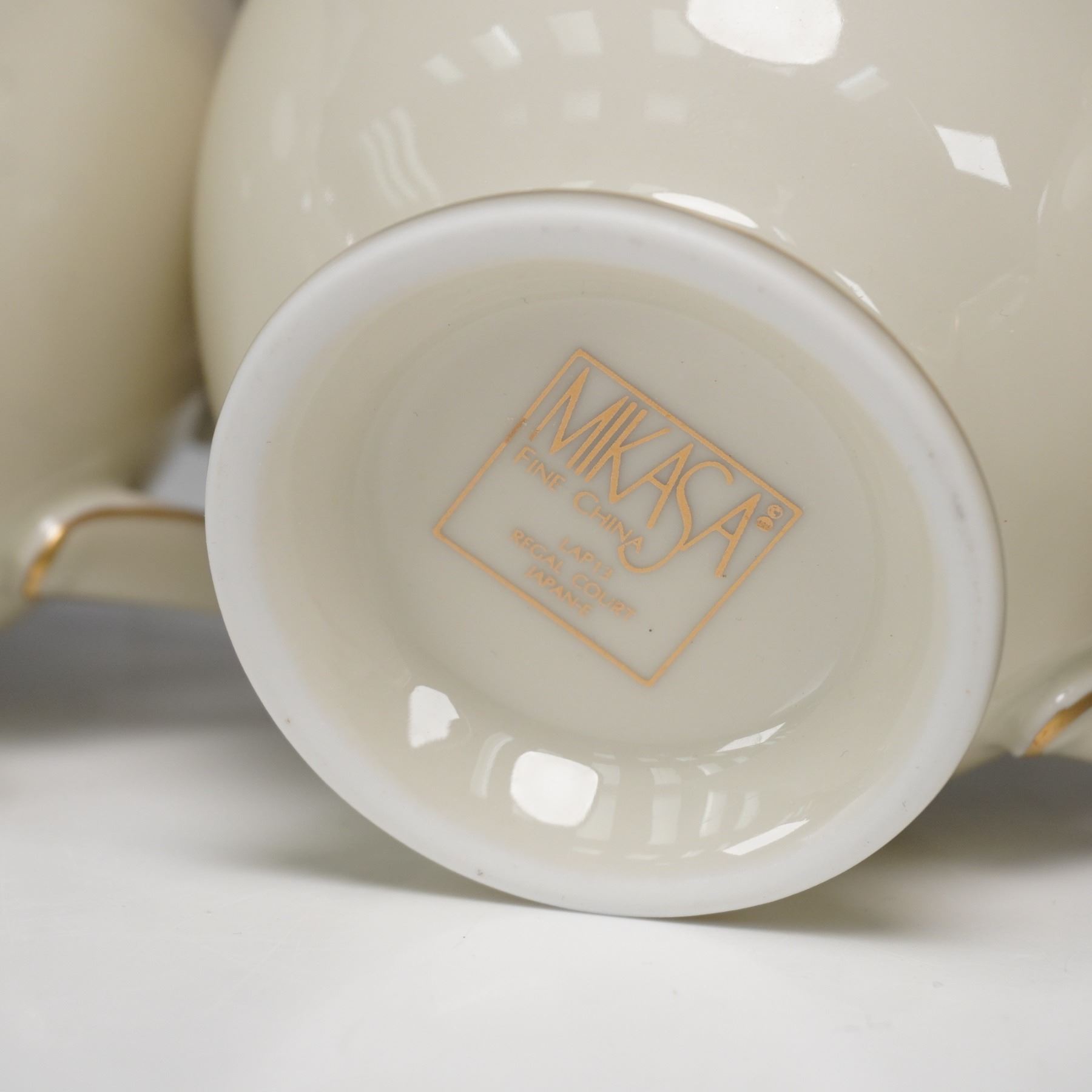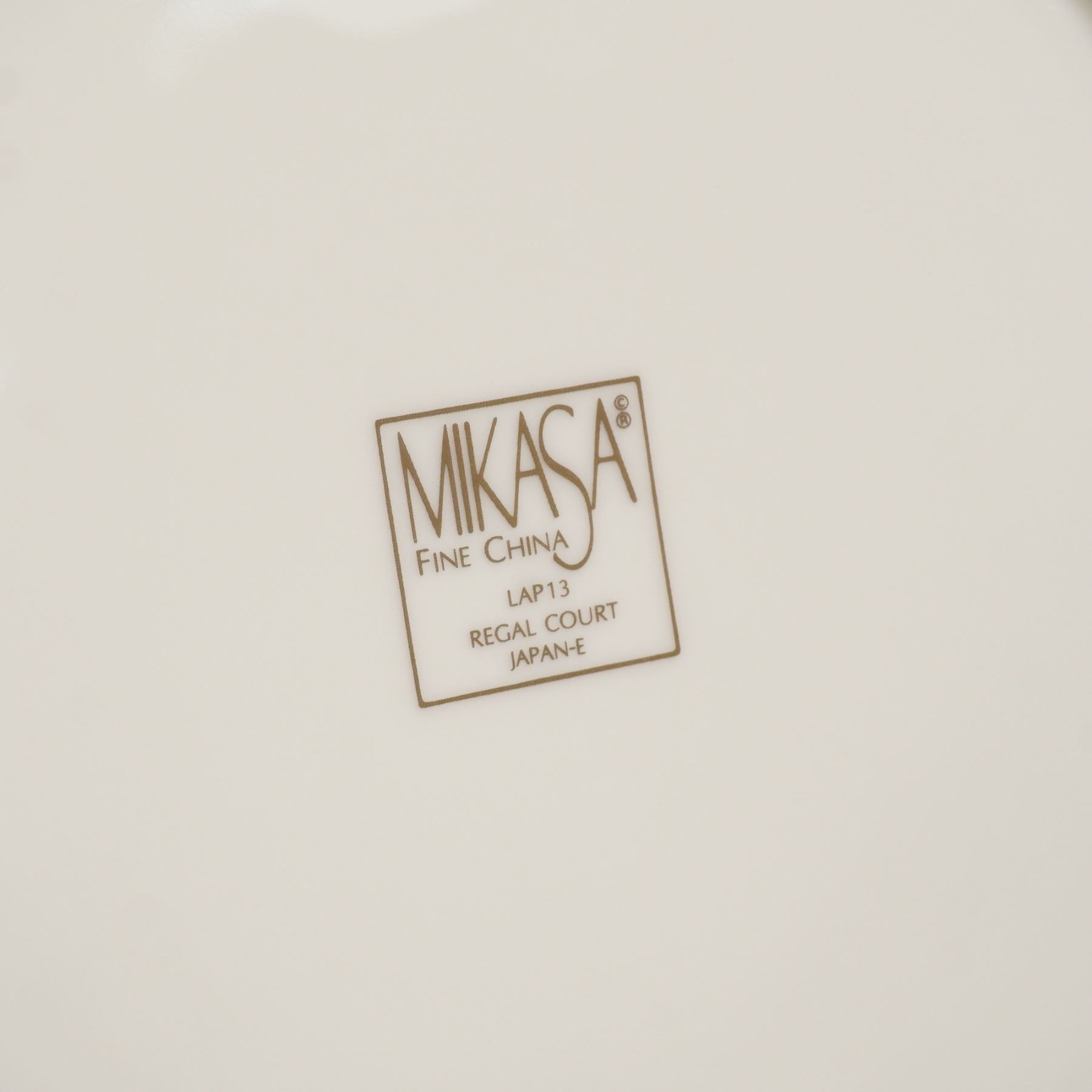 An elegant 64-piece Mikasa fine china dinnerware set in the Regal Court pattern (LAP13), featuring ivory bodies with a classic lattice and scroll border in gold trim. This well-appointed set offers service for eleven with additional serving pieces, perfect for formal dining or special occasions. The full contents include 14 dinner plates, 11 salad/dessert plates, 11 soup or cereal bowls, 11 saucers, 12 cups, a creamer, a lidded sugar bowl, one round serving bowl, and one round serving platter. Each piece is marked "Mikasa Fine China JAPAN-E." All items appear in excellent condition with minimal signs of use.