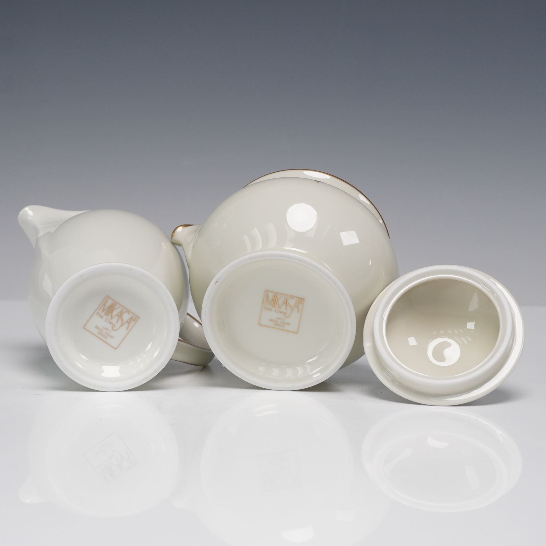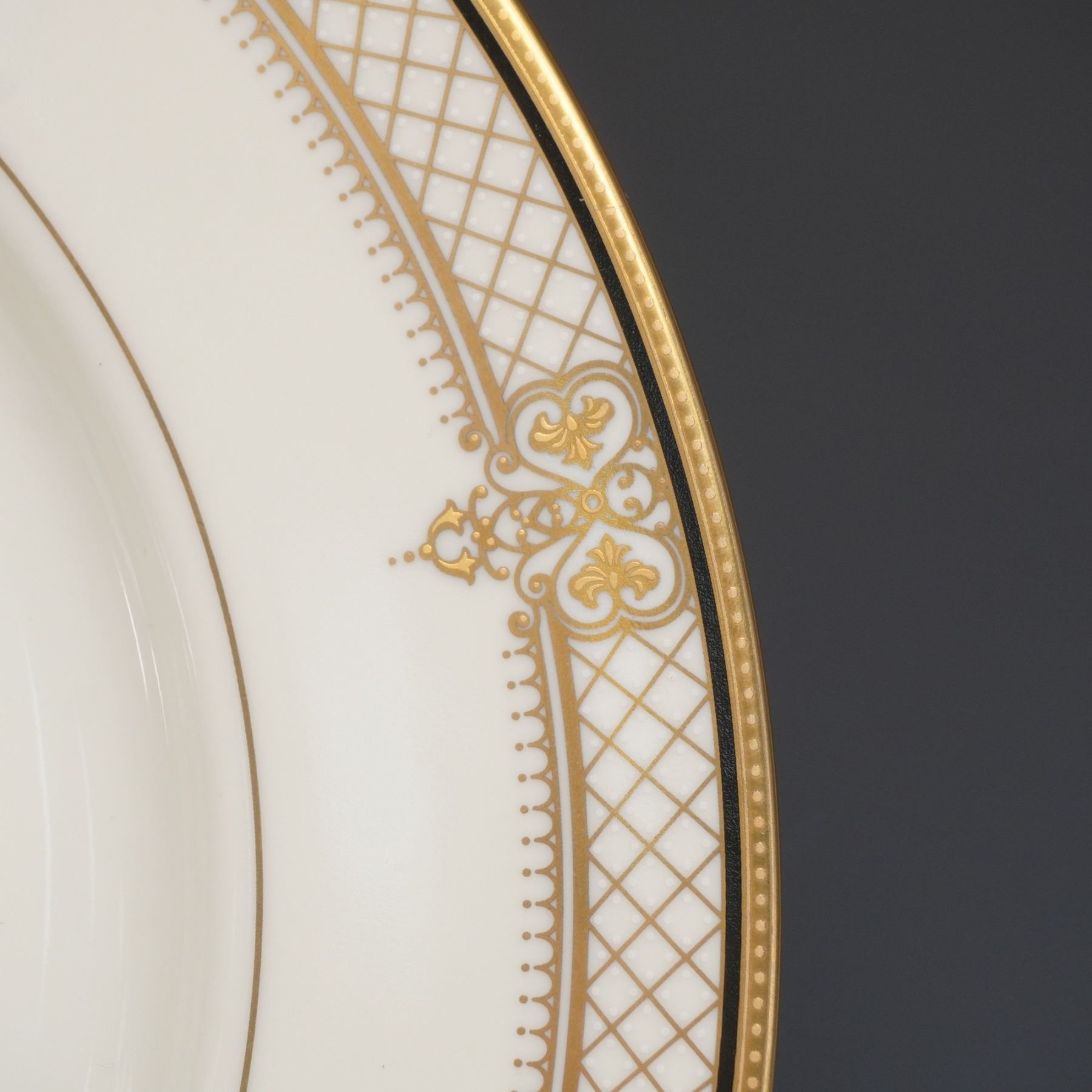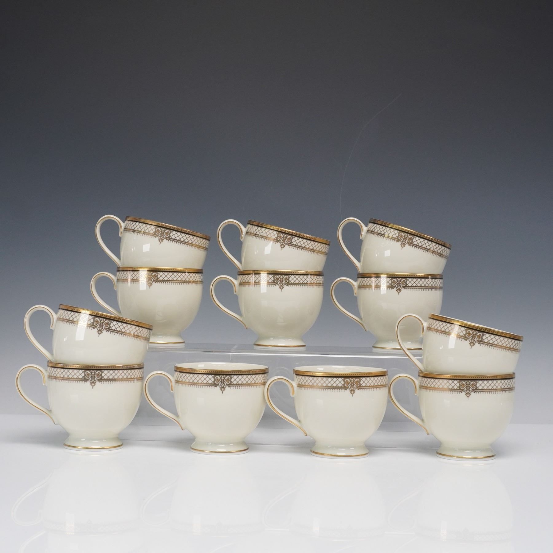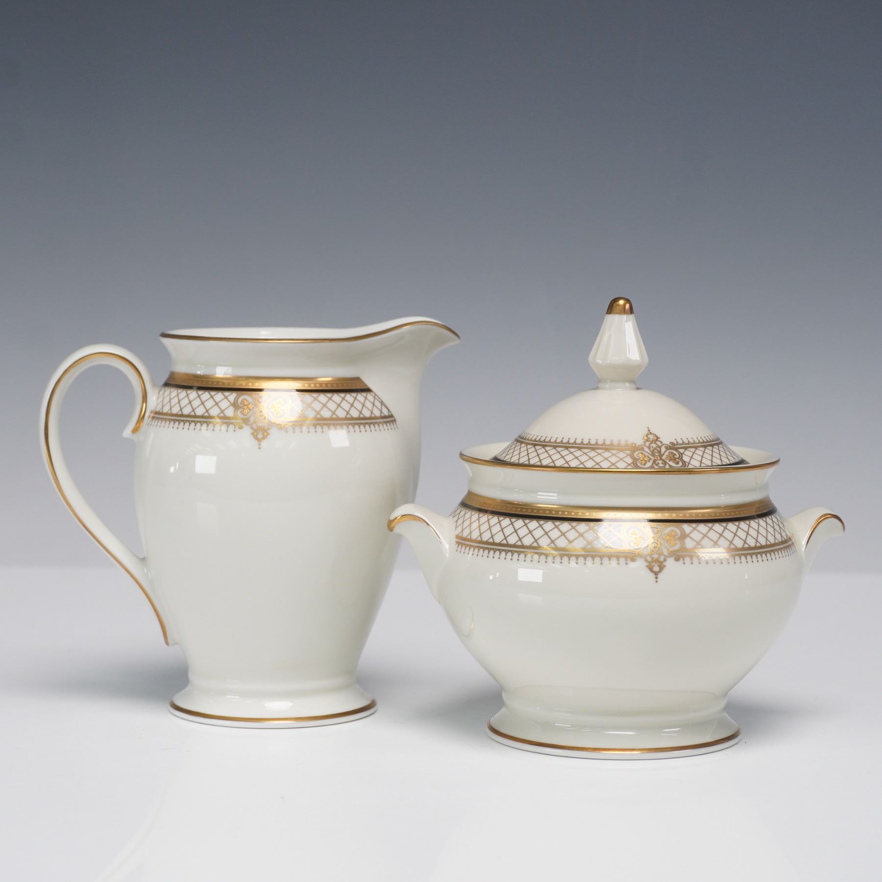An elegant 64-piece Mikasa fine china dinnerware set in the Regal Court pattern (LAP13), featuring ivory bodies with a classic lattice and scroll border in gold trim. This well-appointed set offers service for eleven with additional serving pieces, perfect for formal dining or special occasions. The full contents include 14 dinner plates, 11 salad/dessert plates, 11 soup or cereal bowls, 11 saucers, 12 cups, a creamer, a lidded sugar bowl, one round serving bowl, and one round serving platter. Each piece is marked "Mikasa Fine China JAPAN-E." All items appear in excellent condition with minimal signs of use.
