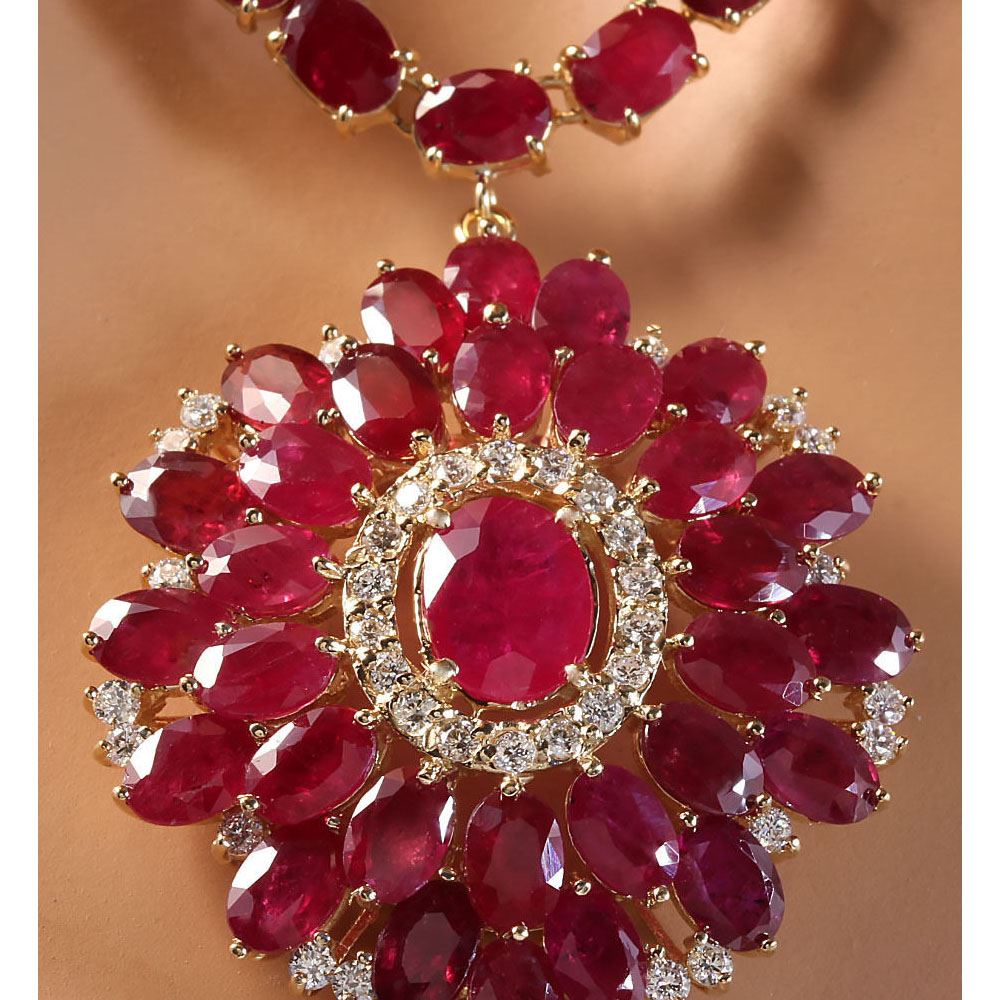 65.00 CTW Natural Ruby And Diamond Necklace In 14K Yellow Gold
