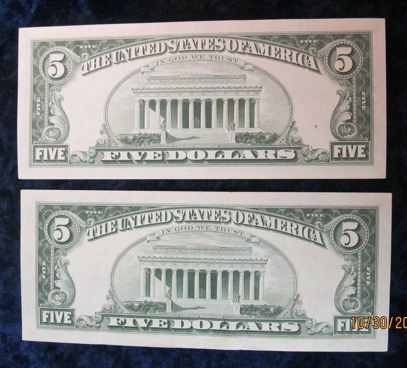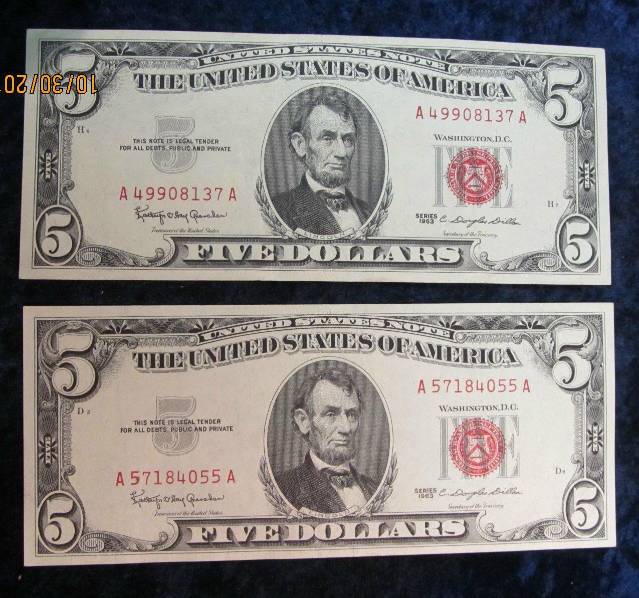65. (2) Series 1963 $5 "Red Seal" U.S. Notes. Almost Unc.