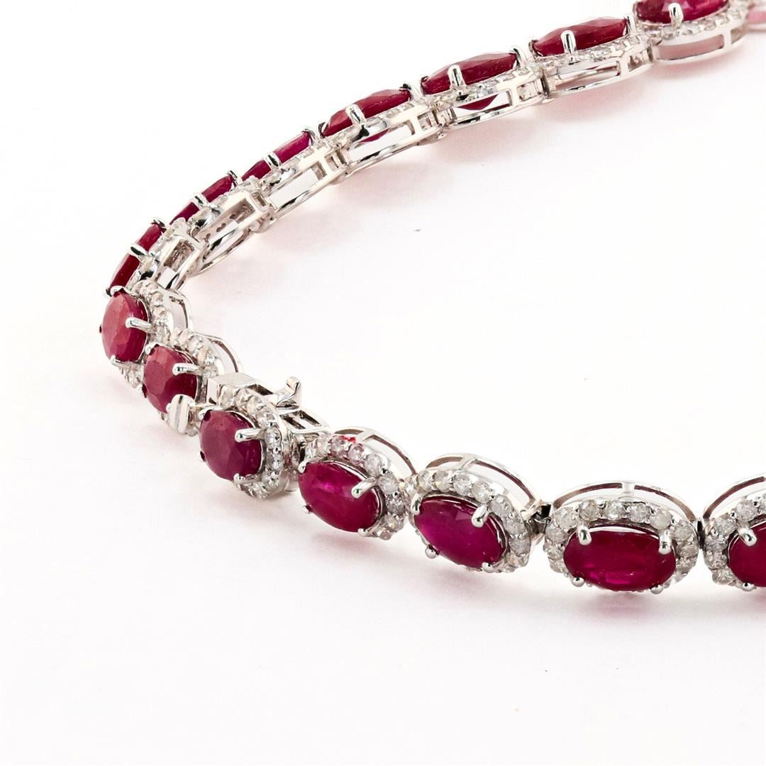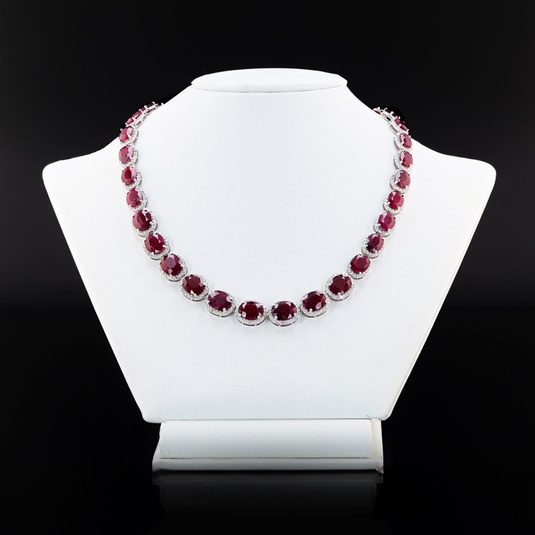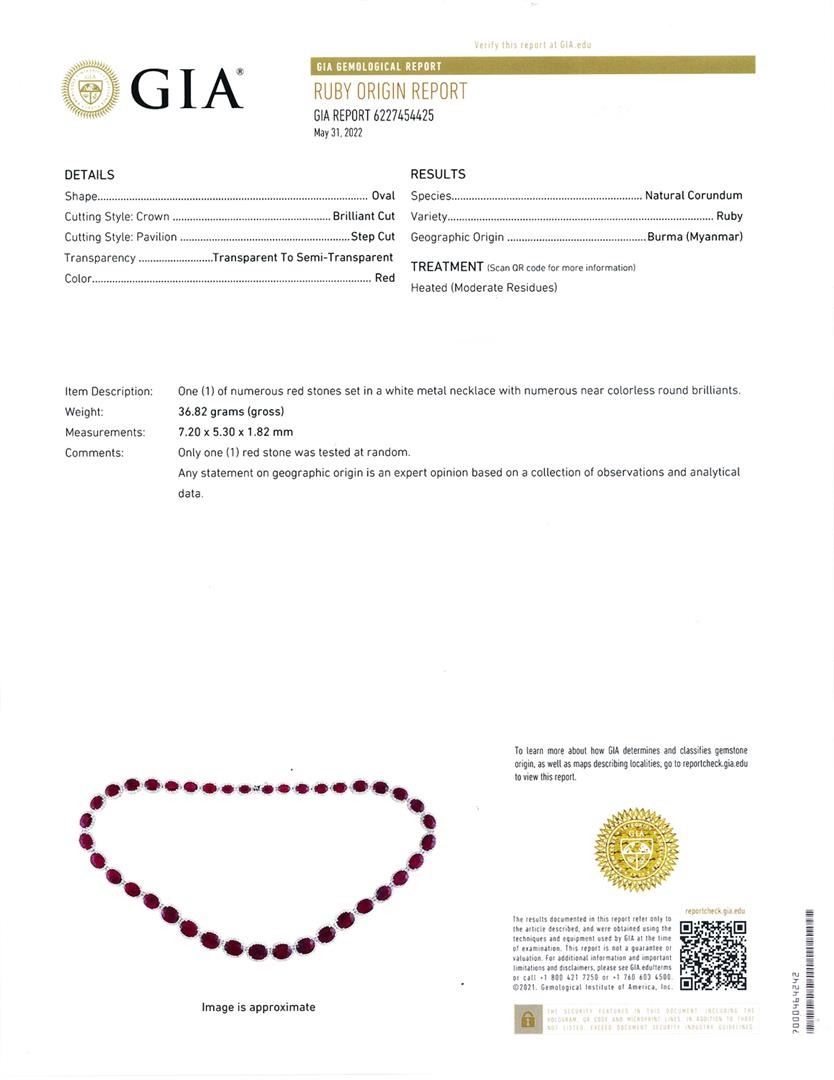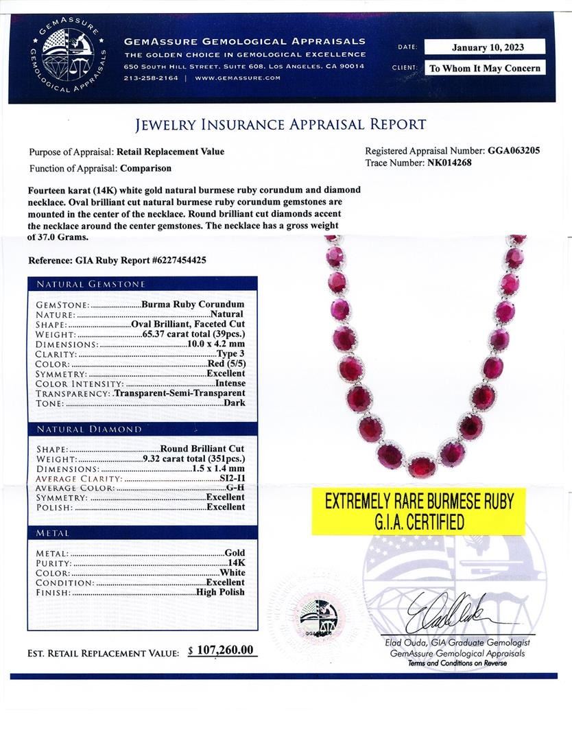 65.37ctw Burmese Ruby and 9.32ctw Diamond 14K White Gold Necklace (GIA CERTIFIED). Fourteen karat (14K) white gold natural burmese ruby corundum and diamond necklace. Oval brilliant cut natural burmese ruby corundum gemstones are mounted in the center of the necklace. Round brilliant cut diamonds accent the necklace around the center gemstones. The necklace has a gross weight of 37.0 Grams. Reference: GIA Ruby Report 6227454425 NATURAL GEMSTONE GEMSTONE: Burma Ruby Corundum NATURE: Natural SHAPE: Oval Brilliant, Faceted Cut WEIGHT: 65.37 carat total (39pcs.) DIMENSIONIS: 10.0 x 4.2mm CLARITY: Type 3 COLOR: Red (5/5) SYMMETRY: Excellent COLOR INTENSITY: Intense TRANSPARENCY: Transparent-Semi-Transparent TONE: Dark NATURAL DIAMOND SHAPE: Round Brilliant Cut WEIGHT: 9.32 carat total (351pcs.) DIMENSIONS: 1.5 x 1.4mm AVERAGE CLARITY: SI2-I1 AVERAGE COLOR: G-H SYMMETRY: Excellent POLISH: Excellent METAL METAL: Gold PURITY: 14K COLOR: White CONDITION: Excellent FINISH: High Polish