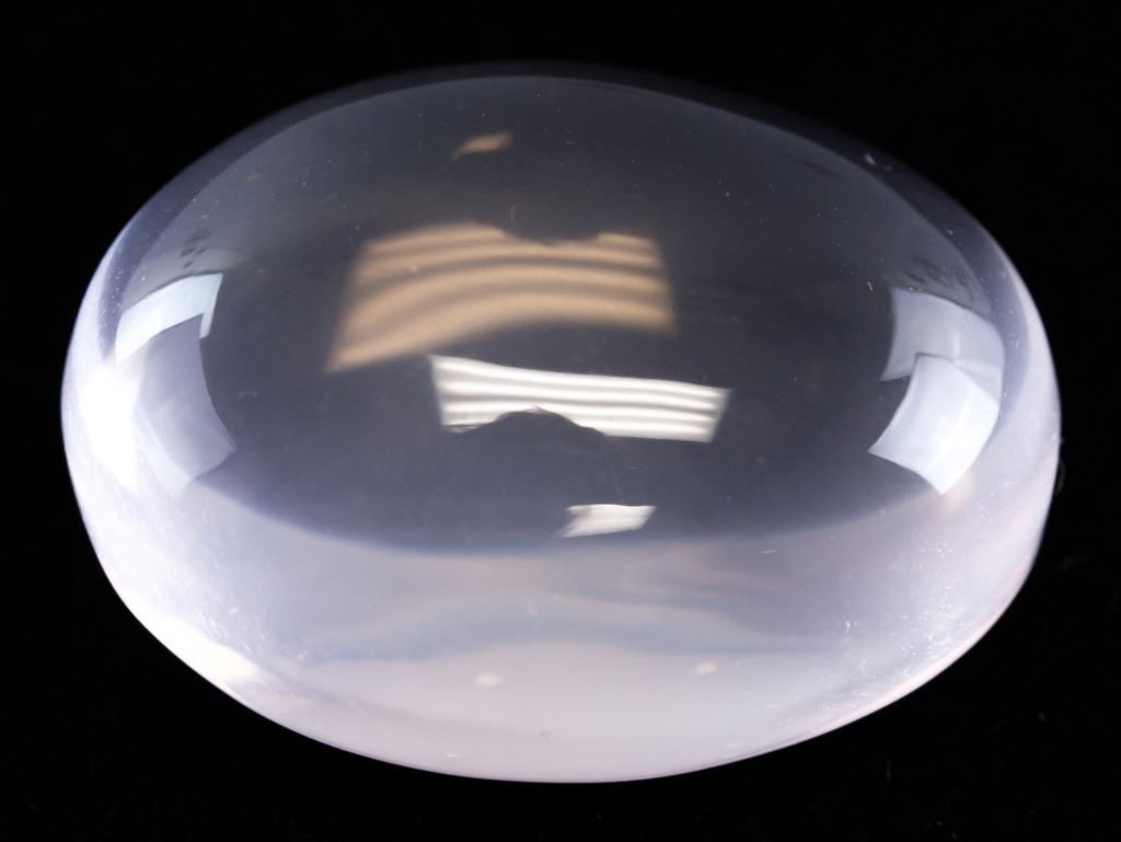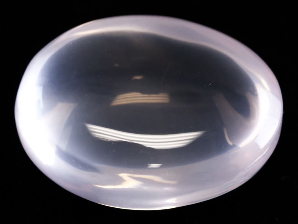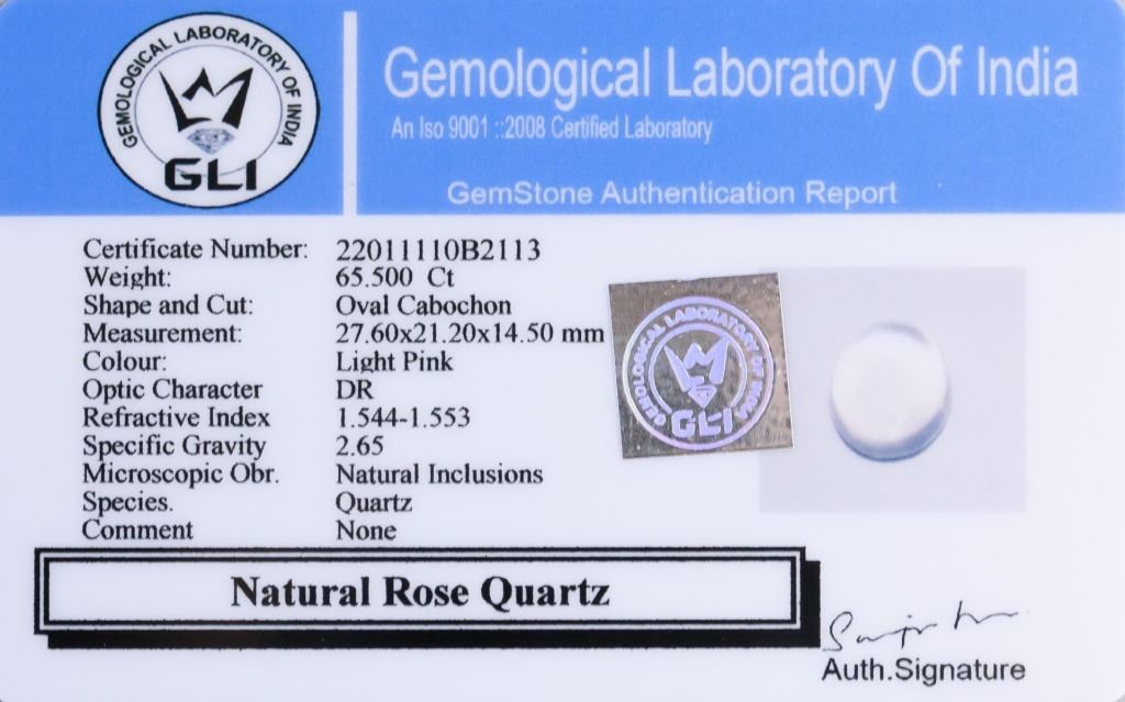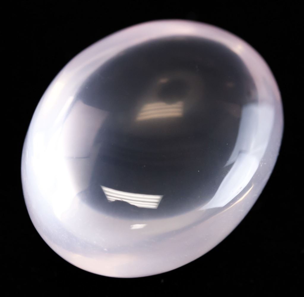 65.50 ct oval cabochon light pink natural rose quartz. Accompanied with GLI certificate. 27.60 x 21.20 x 14.50 mm.