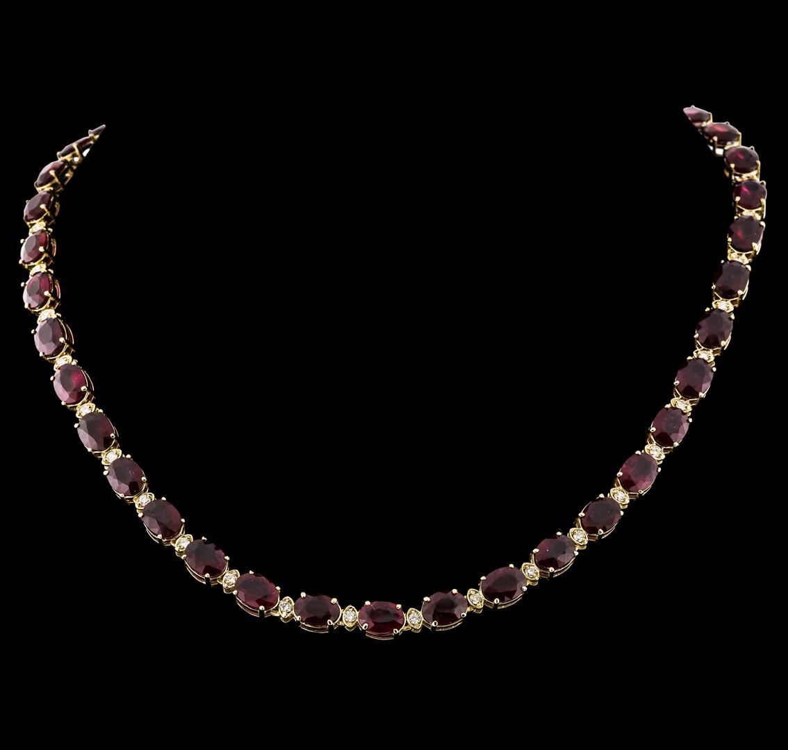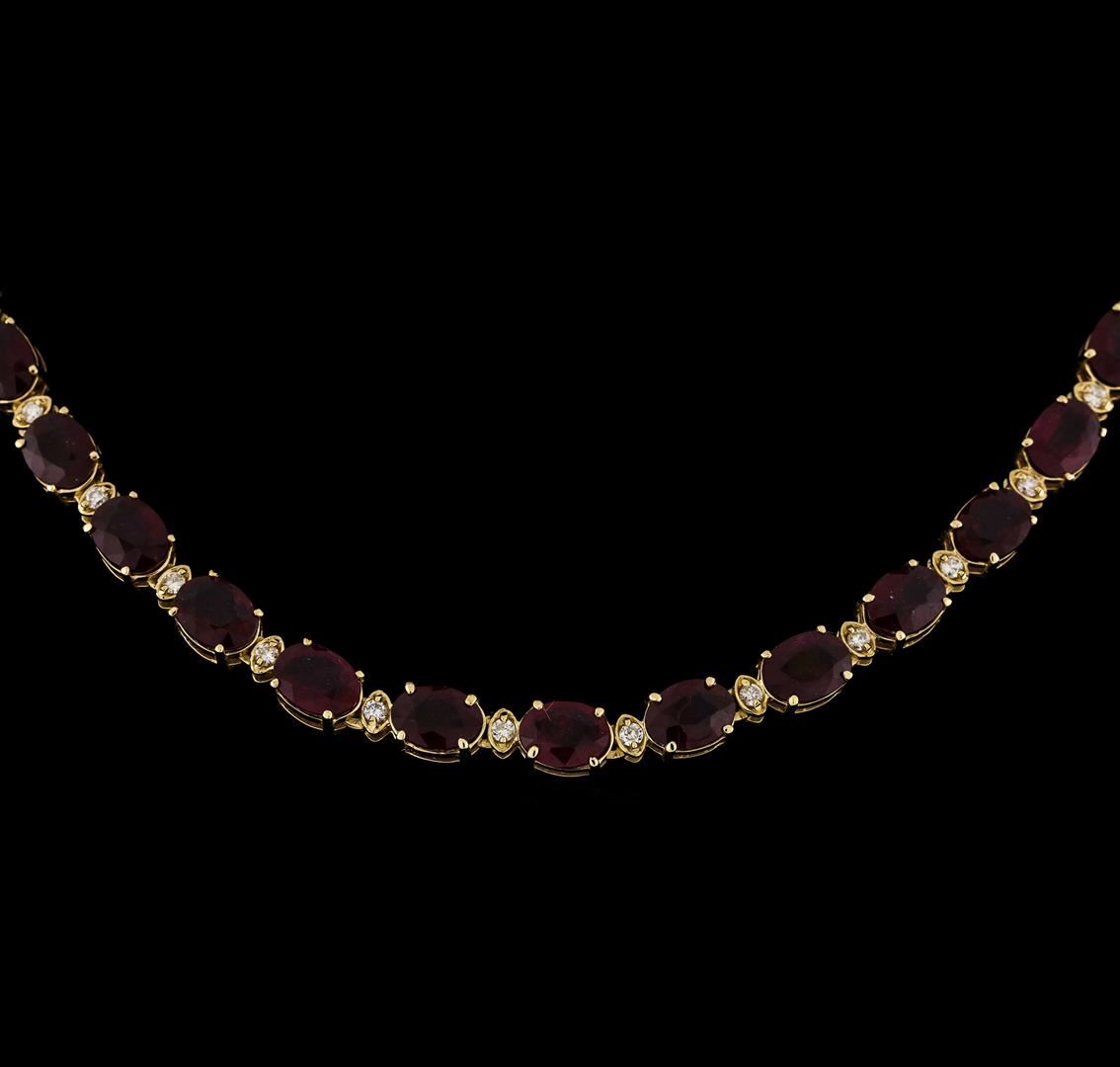 One electronically tested 14KT yellow gold lady's cast fashion necklace with a tongue clasp with foldover safety with a bright polish finish. The featured lady's necklace has alternating ruby and diamond solitaire links and measures approximately 17.25 inches in length. Condition is new, good workmanship. Containing: Forty prong set oval modified mixed cut natural rubies, measuring 8.05 x 6.10 x 3.63mm, (depth est.) 5%. bulge factor, approximate total weight of 65.85ct., clarity is heavily included, medium dark, very slightly brownish, red color, (GIA R 6/3), cut is good. Transmitting light somewhat diffusely, semi-transparent to translucent. Indications of laboratory high temperature heat treatment, with glass & flux additives. Naturally occurring internal & external characteristics are present. Colored gemstones are presumed to have been subjected to commonly used enhancement processes. Graded in the setting. Forty prong set round brilliant cut diamonds, measuring 2.10 - 2.05 x 1.29mm (depth est.) approximate total weight of 40 Stones = 1.36ct. Graded in the setting. Clarity SI to I-1. Color: H - I Cut Good. Total Weight of Colored Stones 65.85ct.. Total Weight of Diamonds 1.36ct.. Total Weight of Necklace 39.40gm. GAS Appraised at $13,720.00.