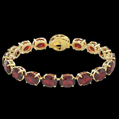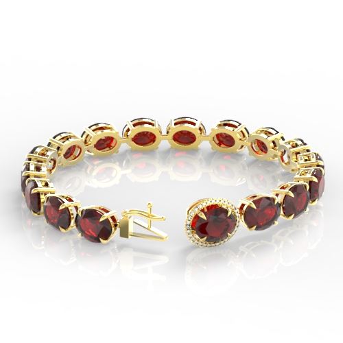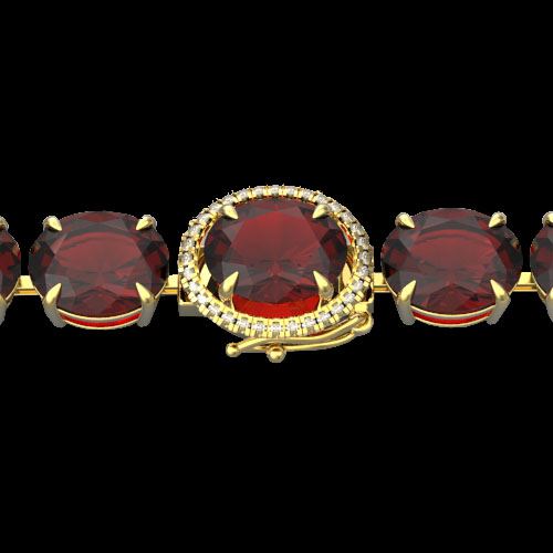 REF-233T3M -22261 ---- 65 CTW Garnet & Micro VS/SI Diamond Halo Designer Bracelet 14K Yellow Gold ---- Luxury Designer Brand Bracelet Appraised at $16,650 Certificate Number US22261 14k Yellow gold, Bracelet Size is 7 1/2 Inches, Bracelet measuring approx. 8 mm x 7 1/2 inches, weighing in total approx. 20 grams. Made in the USA and is stamped 14k, Main stone 64.75 carat total weight containing 20 pieces of Saturated purplish Red color with AAA quality Oval shape cut Garnet , Stone #2 0.25 carat total weight containing 32 pieces of H-I color with VS/SI quality Round shape cut Diamond