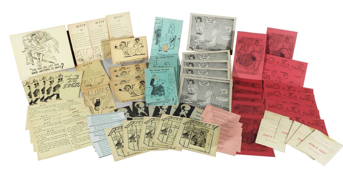 Lot of 65 Risqué Arcade Cards. Including Its not so tuff to be sick, The Pistol Tavern and Kitty. Various sizes, all in good condition.