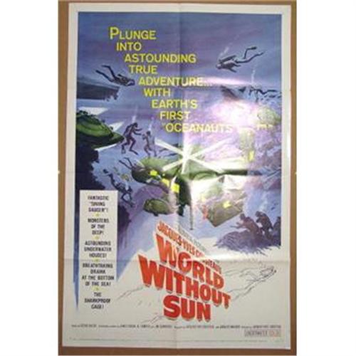 This is an original one sheet poster from the 1965 film, WORLD WITHOUT SUN, starring Jacques Cousteau. Condition comments: pinholes; staple holes; tear at center upper fold. Measures 27" x 41".