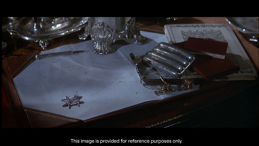 This faux steel medal originated from the collection of executive producer Elmo Williams, who put it up for sale at Pacific Coast Antiques Mall in Harbor, Oregon. Modeled after a real-world Blue Max with ornate eagle-shaped detailing, it is hand-painted in blue enamel, engraved "Pour Le Merite," and mounted to a sheet describing the plot of the film inside a custom frame. It exhibits one of the eagles broken off since production, and the enamel exhibits flaking. Dimensions: (framed) 9.5" x 9.5" x 1.25" (24.25 cm x 24.25 cm x 3 cm)
