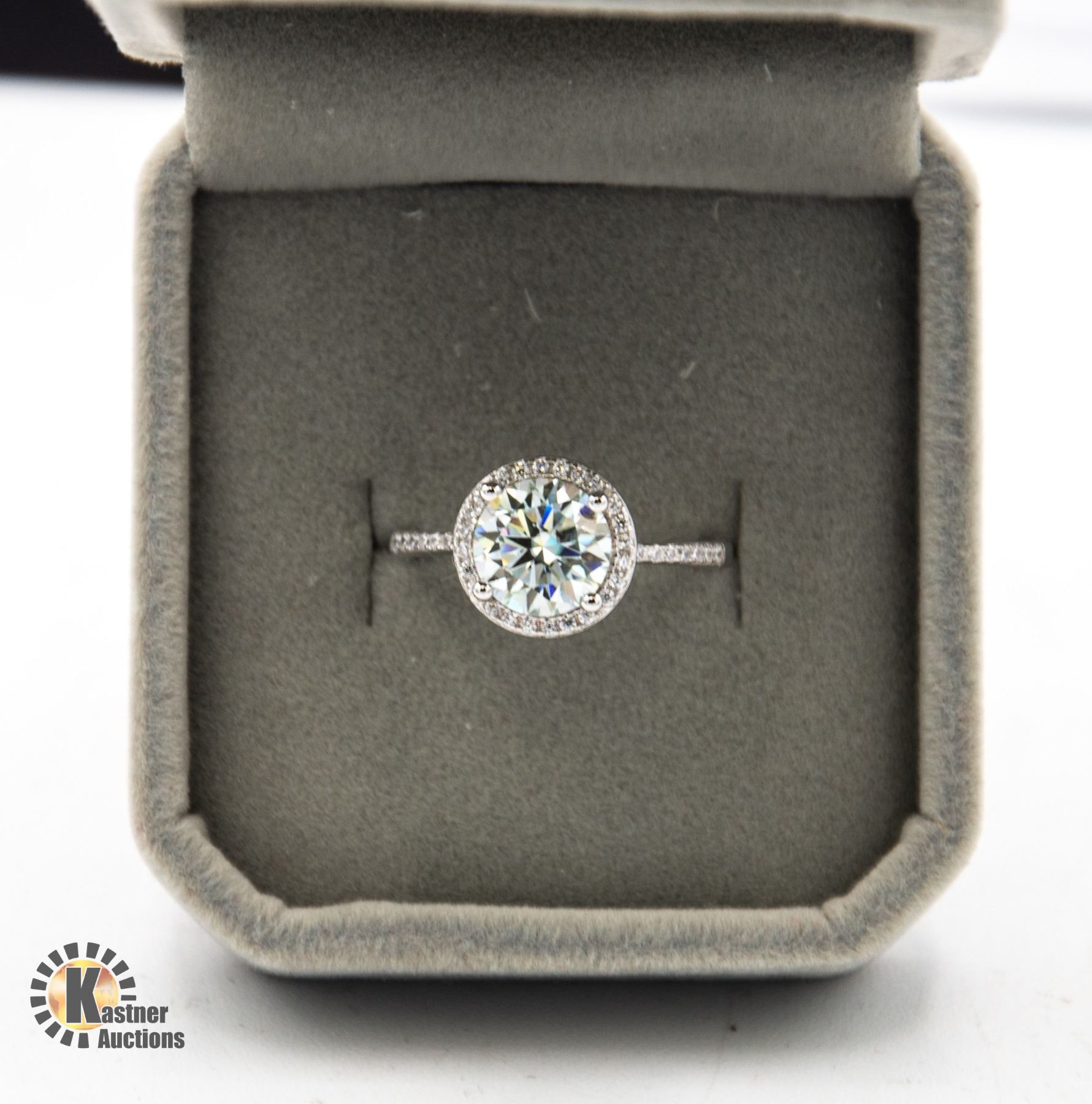 MOISSANITE SET IN S925 WITH 35 CUBIC ZIRCONIUM IN HALO AND WITH MORE IN SHANK OF RING. BAND SIZE IS ADJUSTABLE APPRAISED VALUE $2,100.00