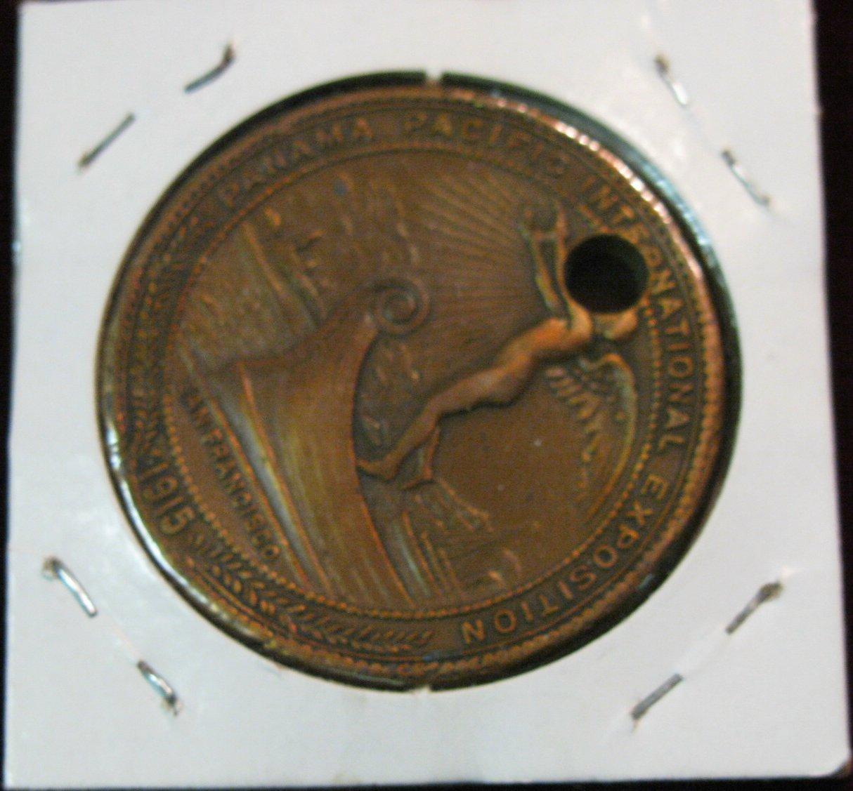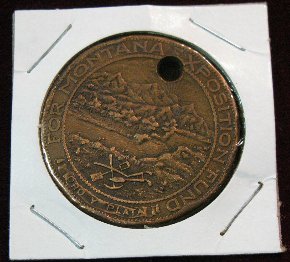 653. 1915 Panama Pacific International Exposition San Francisco Medal. "For Montana Exposition Fund Oro y plata", Copper. Holed.