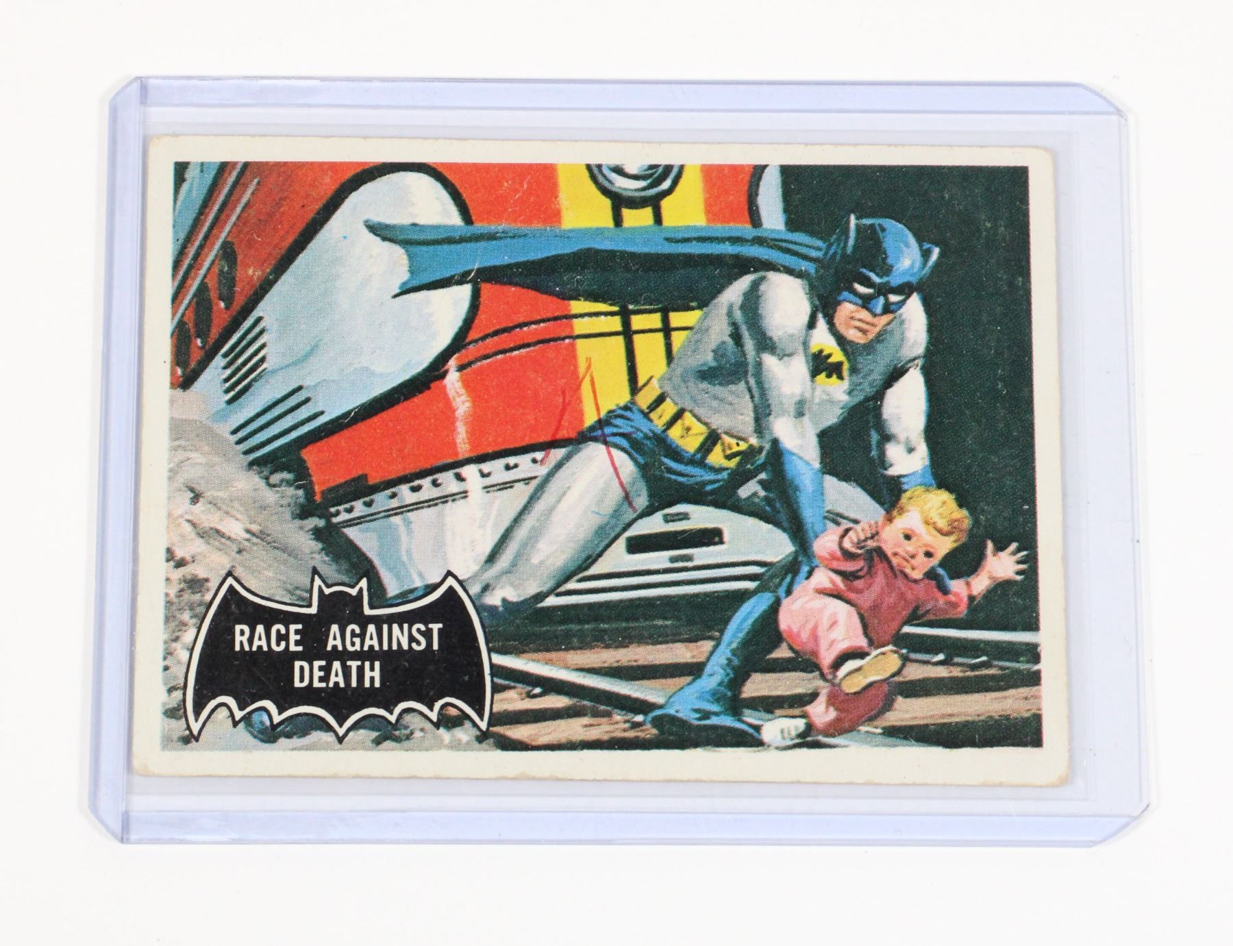 RACE AGAINST DEATH CANADIAN O-PEE-CHEE VARIATION OF TOPPS CARD, WORN CONDITION- INCLUDES PLASTIC PROTECTIVE SLEEVE AND ADDITIONAL SLEEVE. 1966 BATMAN CARD THE BATMAN