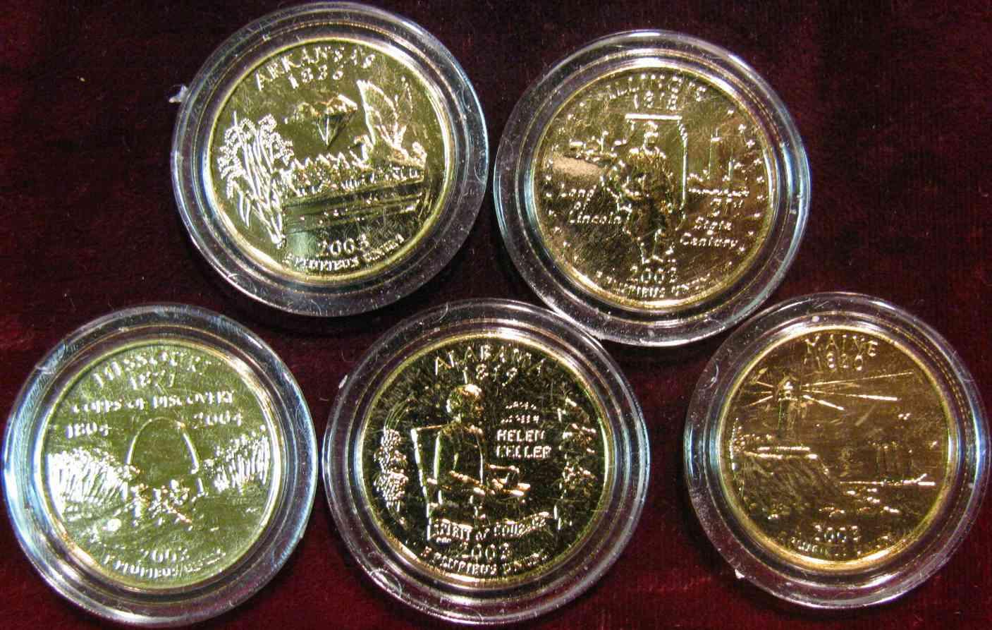 654. (5) Different 2003 Statehood Quarters. All with 24K Gold overlay & encapsulated.