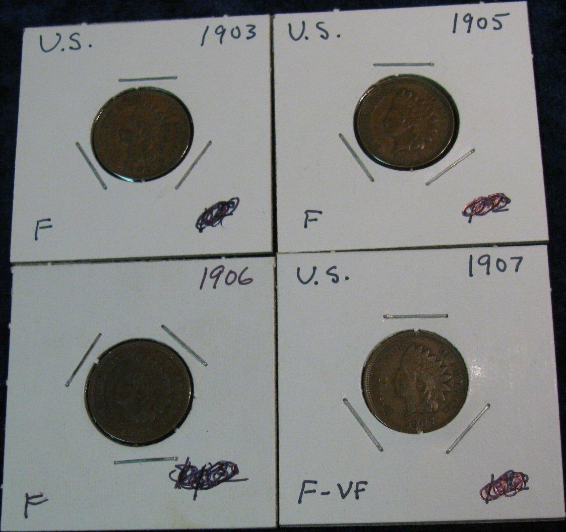 656. 1903, 05, 06, & 07 Indian Cents. F-VF.