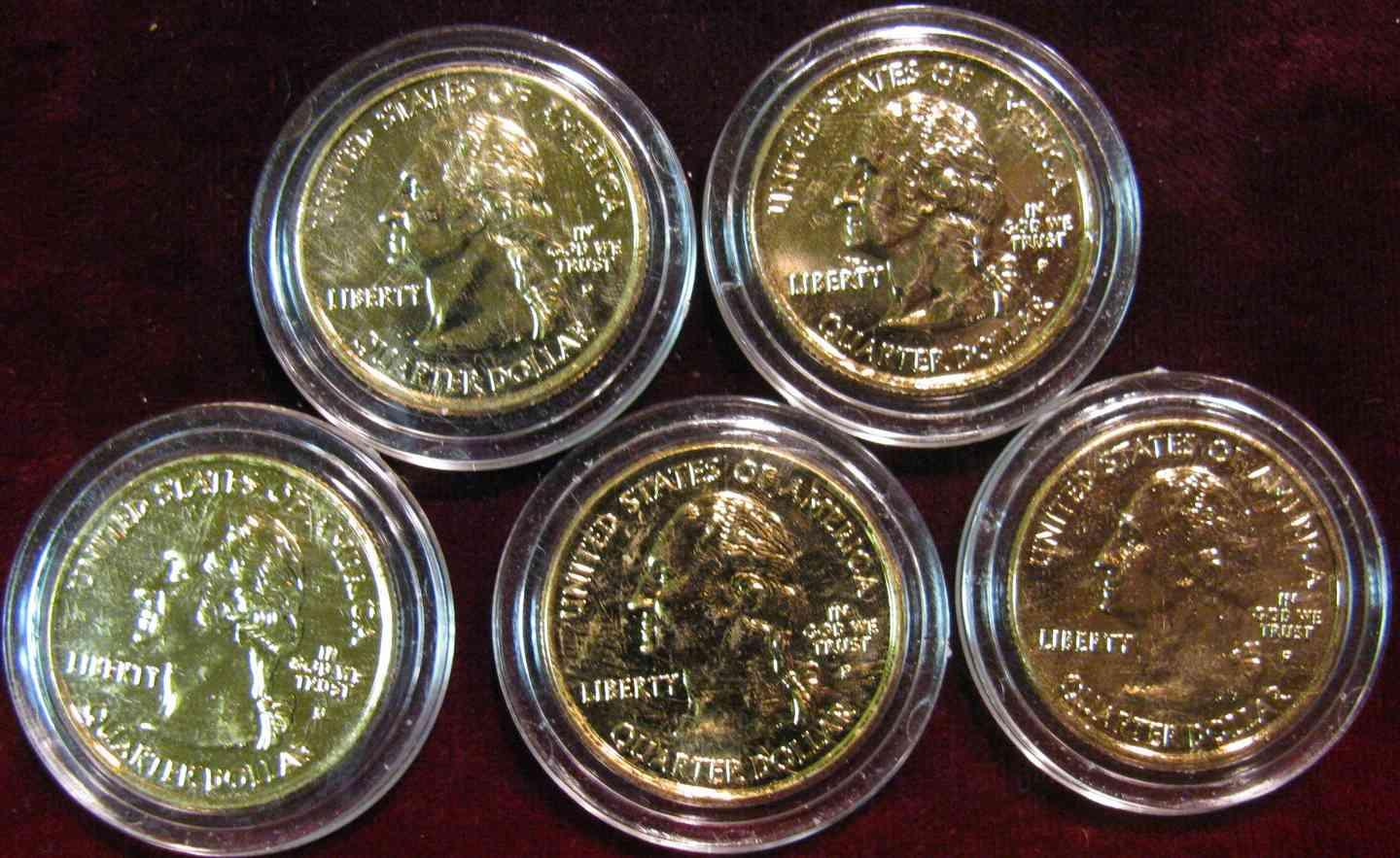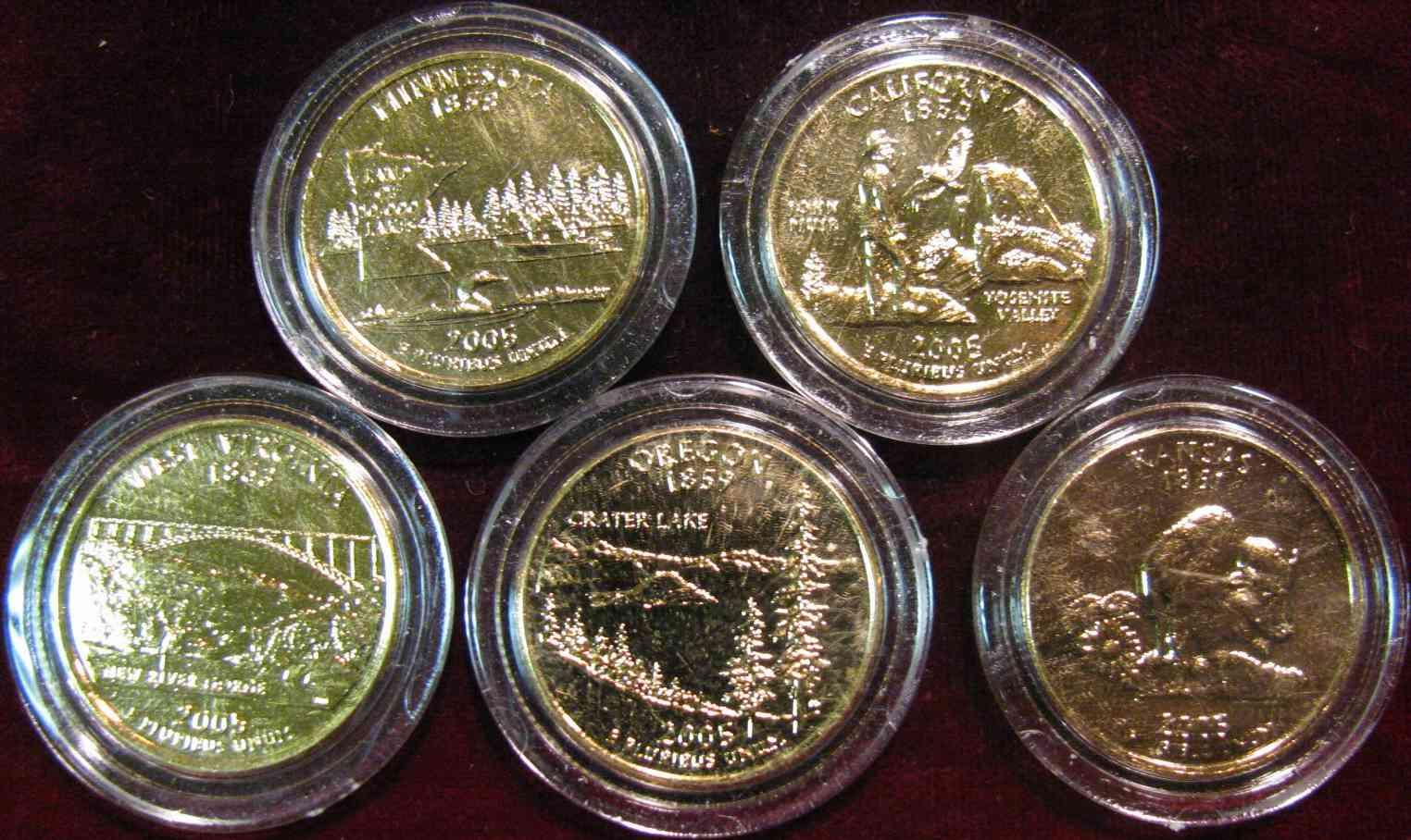 656. (5) Different 2005 Statehood Quarters. All with 24K Gold overlay & encapsulated.