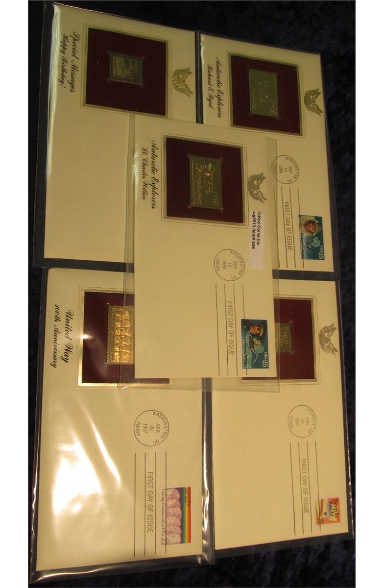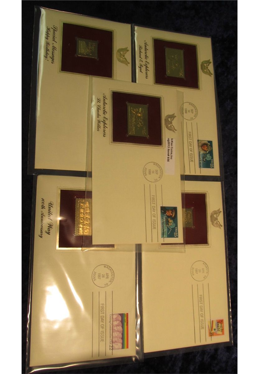 656. (5) First Day Commemorative Stamped Covers with 22K Gold U.S. Stamp Replicas 1987-88. Minted by the Postal Commemorative Society.