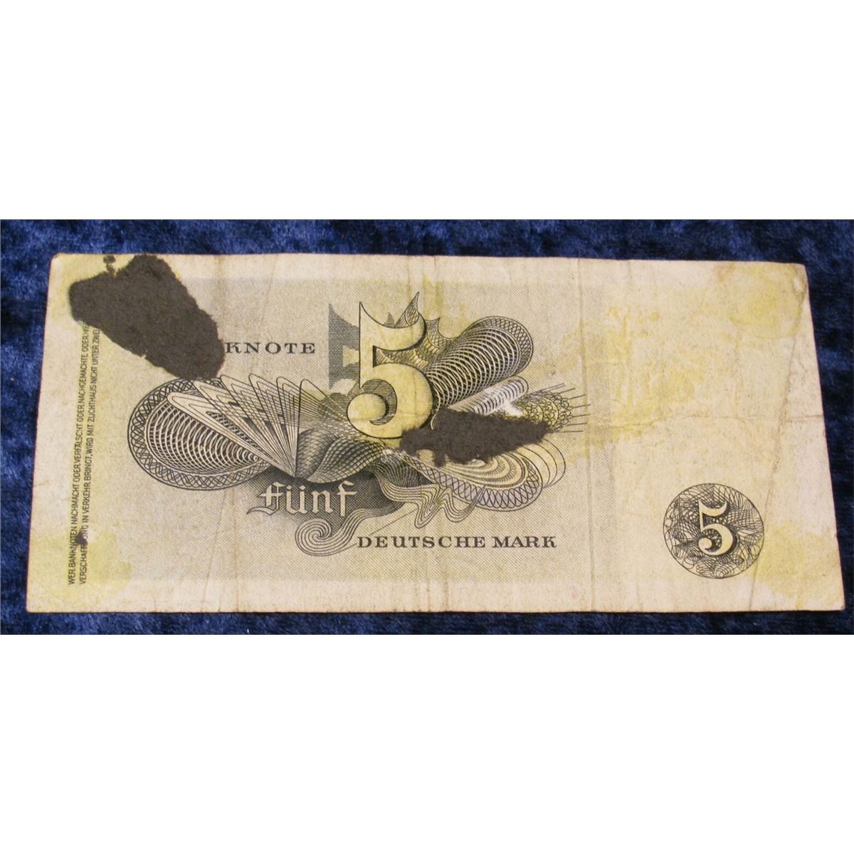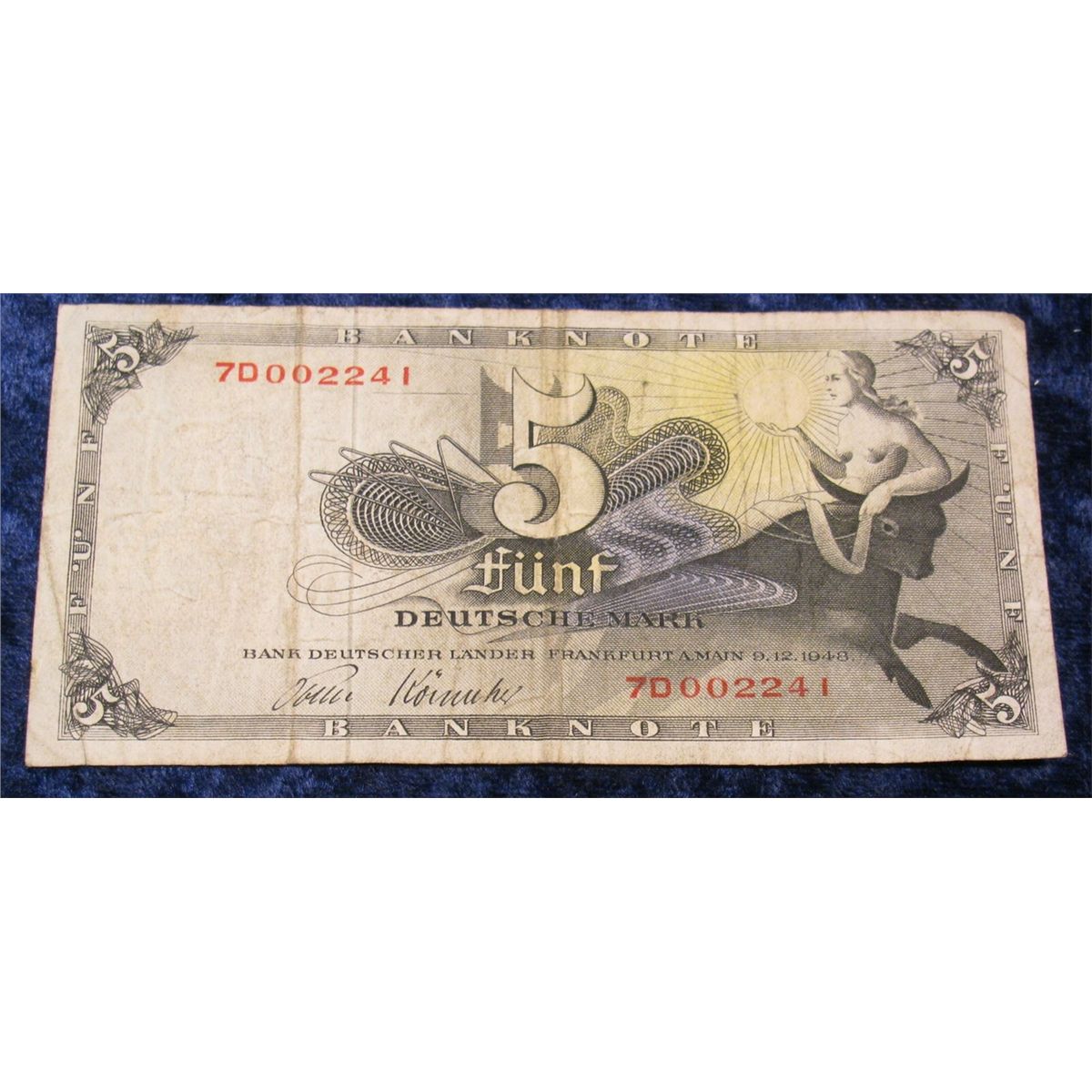 659. 1948 German Five Mark Bank Note with Nude Woman riding Bull. Mounted at one time on the reverse. Black paper still attached.