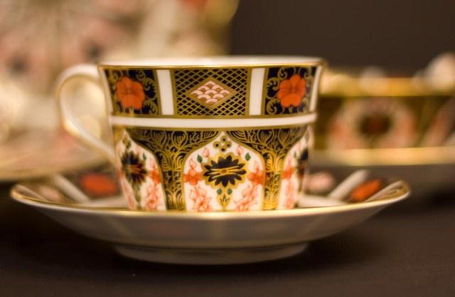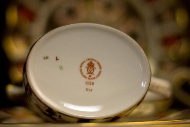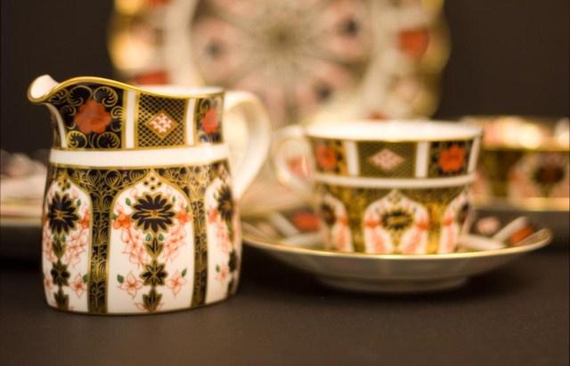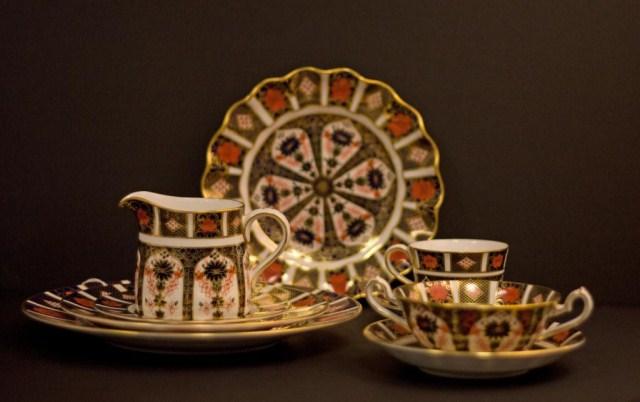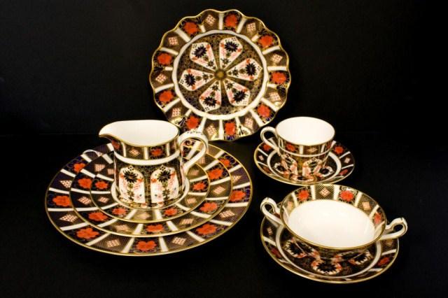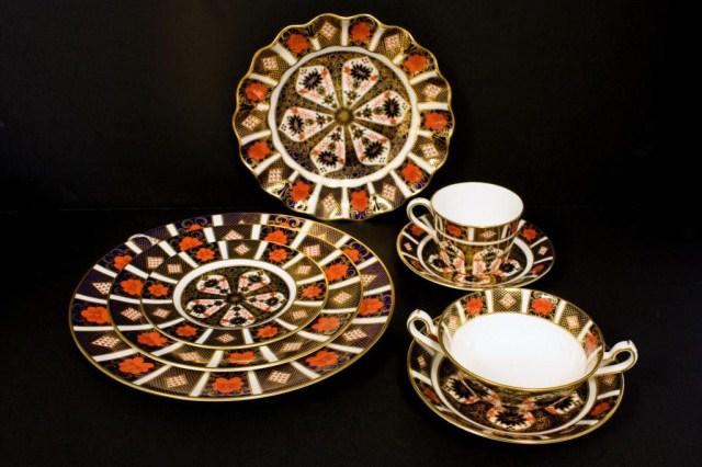 This set is the highly sought after Old Imari pattern. Pattern number 1128. Set includes 8 Dinner plates 10 5/8" diameter, $250/ea. retail. 8 Salad plates, 8 1/2" diameter $190/ea. retail. 8 Sheffield dessert plates, 8 5/8" diameter, $395/ea. retail. 8 Bread & butter plates, 6 3/8" diameter, $120/ea. retail. 8 Cream soup cups, 2" height. $250/ea. retail. 8 Cream soup saucers 6 1/2" diameter, $120/ea. retail value. 8 Teacups, 2 5/8" height, $170/ea. retail. 8 Teacup saucers, 5 7/8" diameter, $120/ea. retail. 1 creamer, 3 1/2" height, $270 retail. Set has a total retail value of $13,350.00. Set is in excellent condition with no chips, cracks, crazing, repairs or breaks. Set was very, very, very lightly used if used at all.
