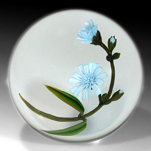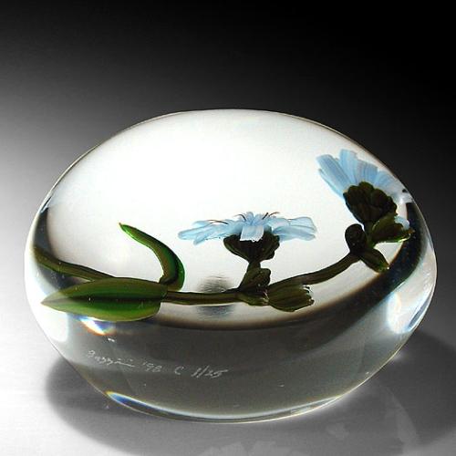 Chris Buzzini 1998 "Chicory" paperweight, containing pale blue chicory blossoms, with square-edged petals, on a stem with buds and dark green leaves, over clear ground. Signed/dated. Limited edition #1 of 25. Diameter 3 3/8". NO RESERVE