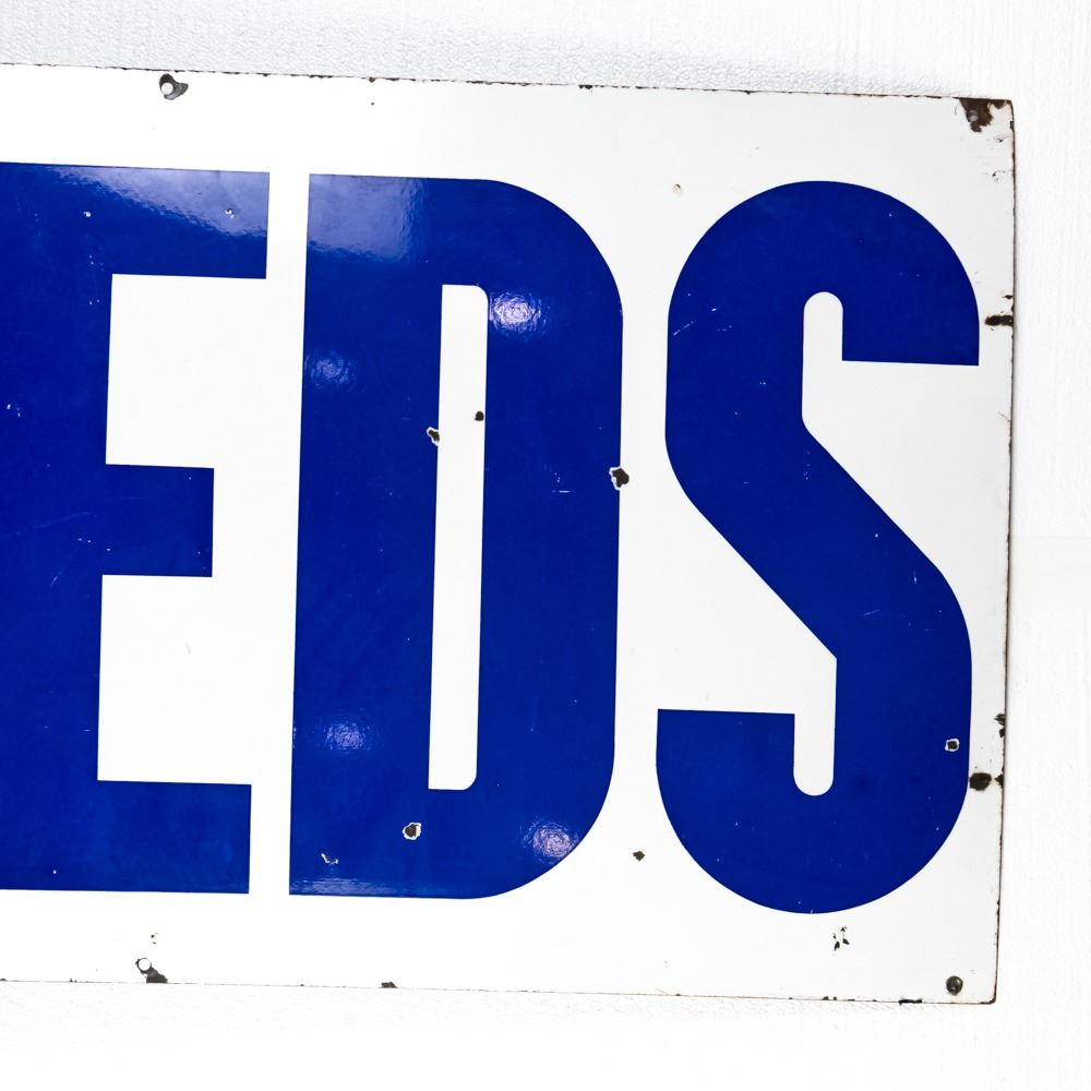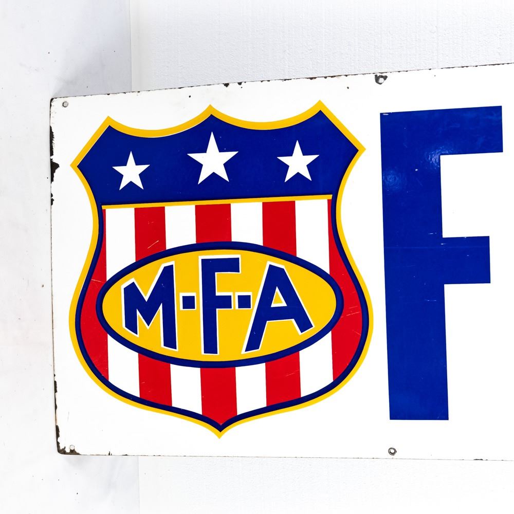 Vintage "MFA FEEDS" single sided porcelain advertising sign. Presents well with bold eye catching color and gloss along with large size. Very good overall condition with some stray marks/ scratches, discoloration and chipped porcelain in areas. Approximately 24"t x 66"l. Please use photos to judge condition and bid accordingly.