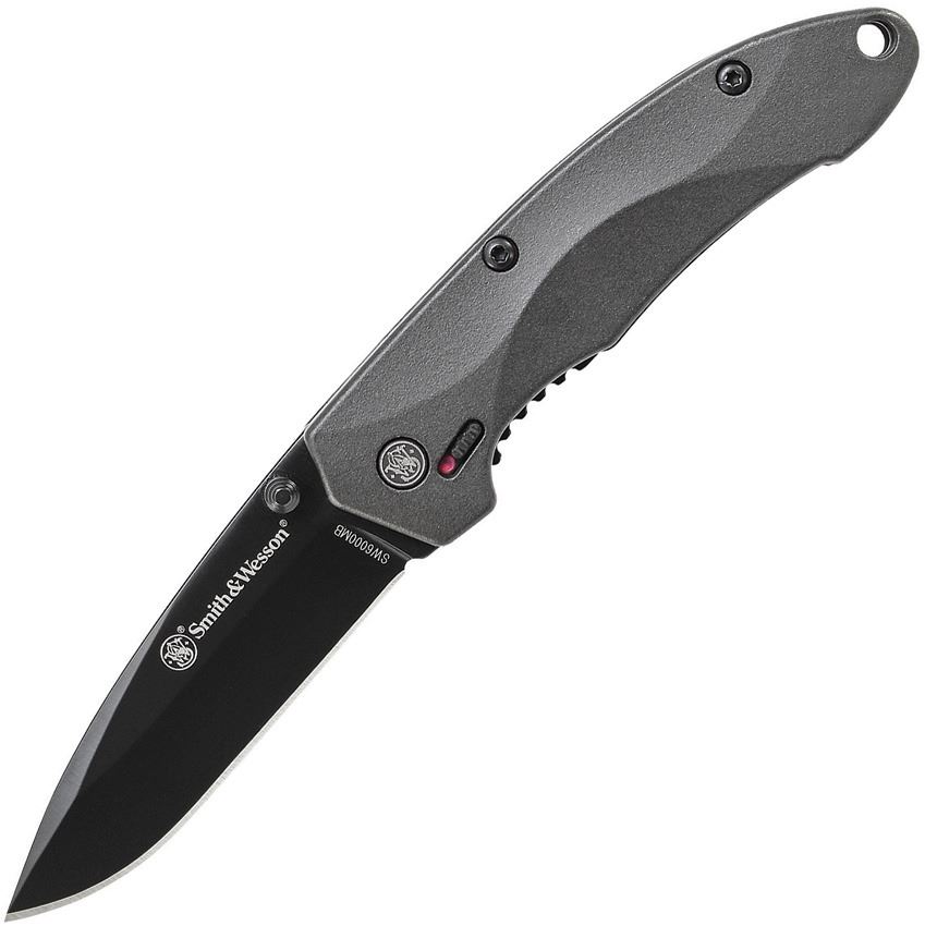 Type: Assisted Opening; Closed: 3.25"; Blade: 2.25" l 4034 Stainless l Standard Edge l Black Finish; Handle: Gray l Aluminum; Other Info: Thumb Stud(s) l Extended Tang l Lanyard Hole l Pocket Clip. Drop point blade with safety lock.