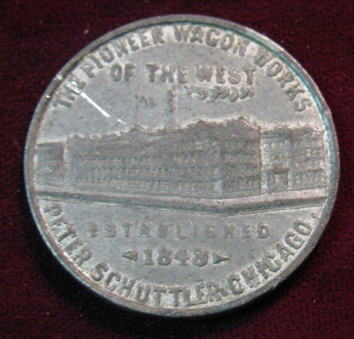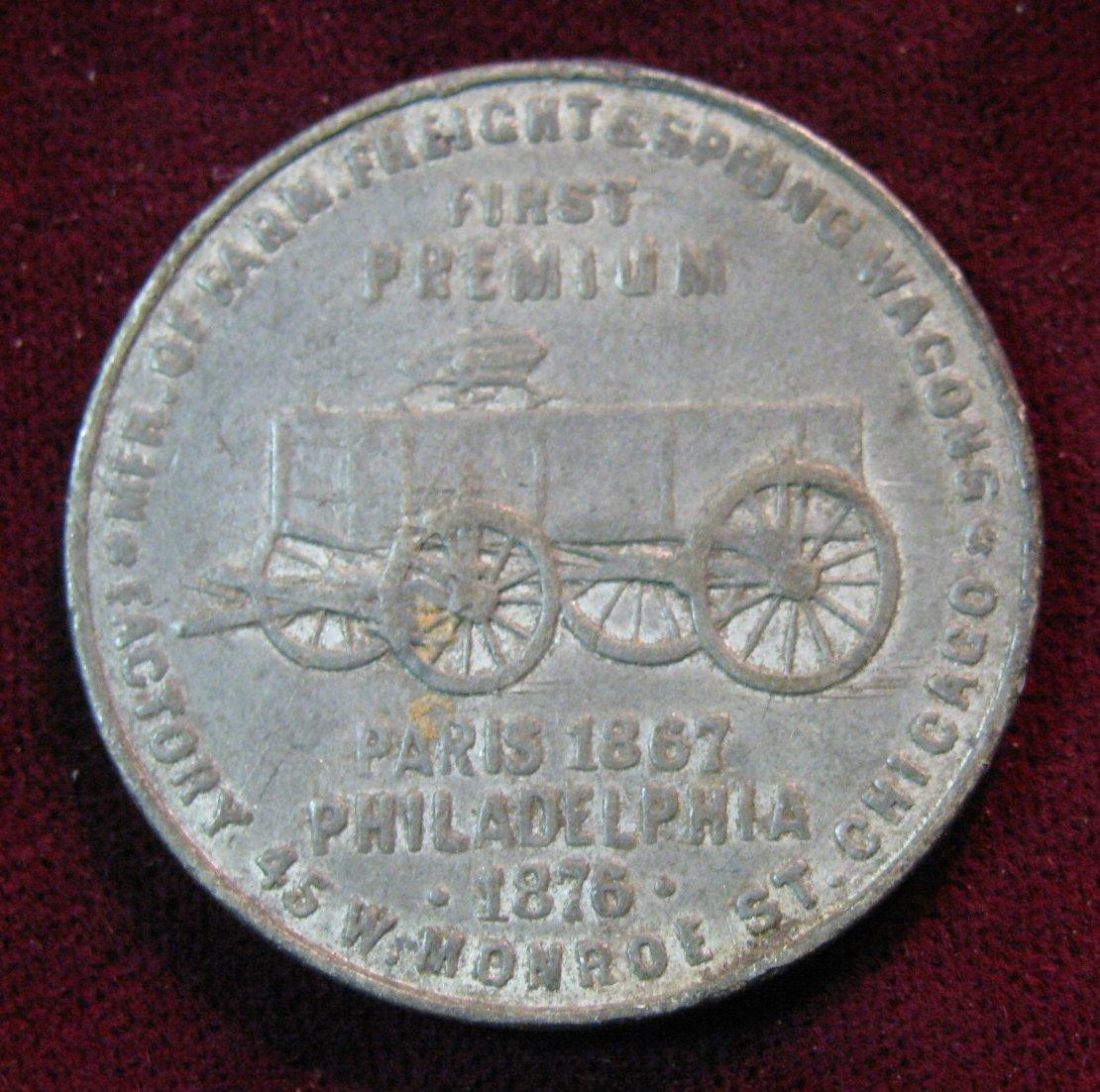 661. First Premium Medal Paris 1867 Philadelphia 1876 "The Pioneer Wagon Works of the West" Pewter medal. 32mm.