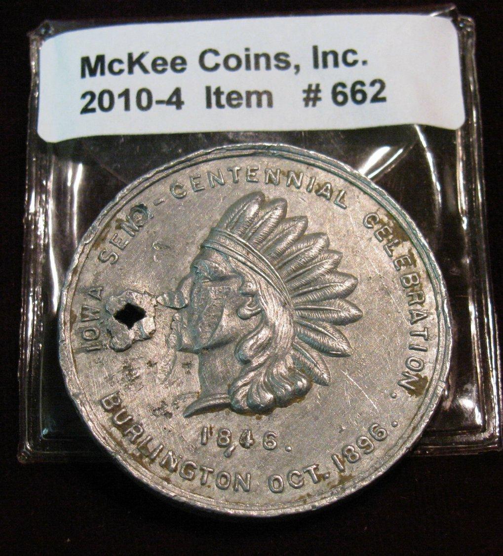 662. 1846-1896 Iowa Semi-Centennial Celebration Medal. Burlington. Indian Head obverse, State seal reverse. Extremely rare. Holed.
