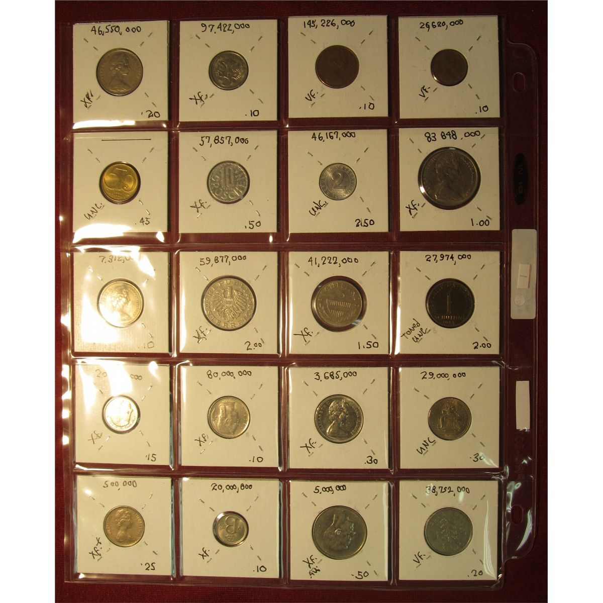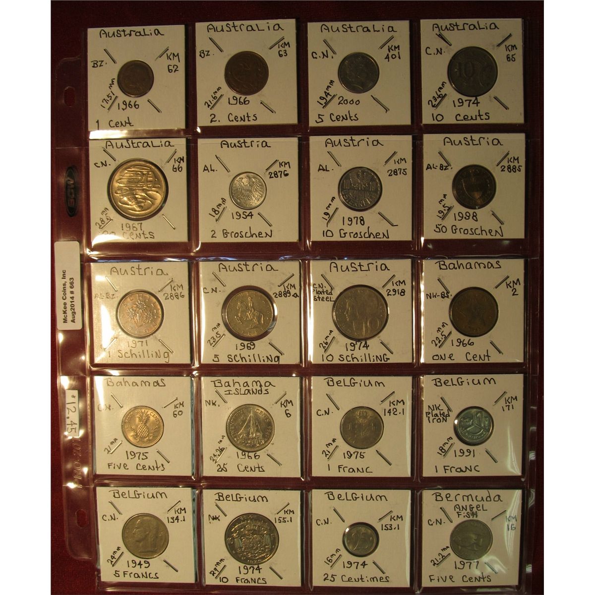 663. (20) World Coins in a plastic page. All identified and in 2" x 2" holders, includes Australia, Austria, Bahamas, Belgium, & Bermuda. KM Value $12.45.