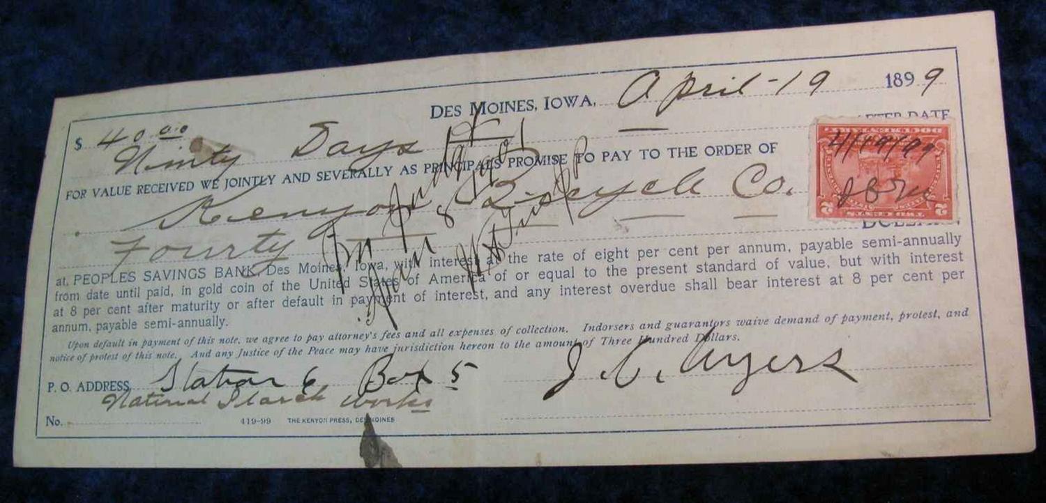 664. 1899 Des Moines, Iowa Promissory Note with 2c Documentary Stamp.
