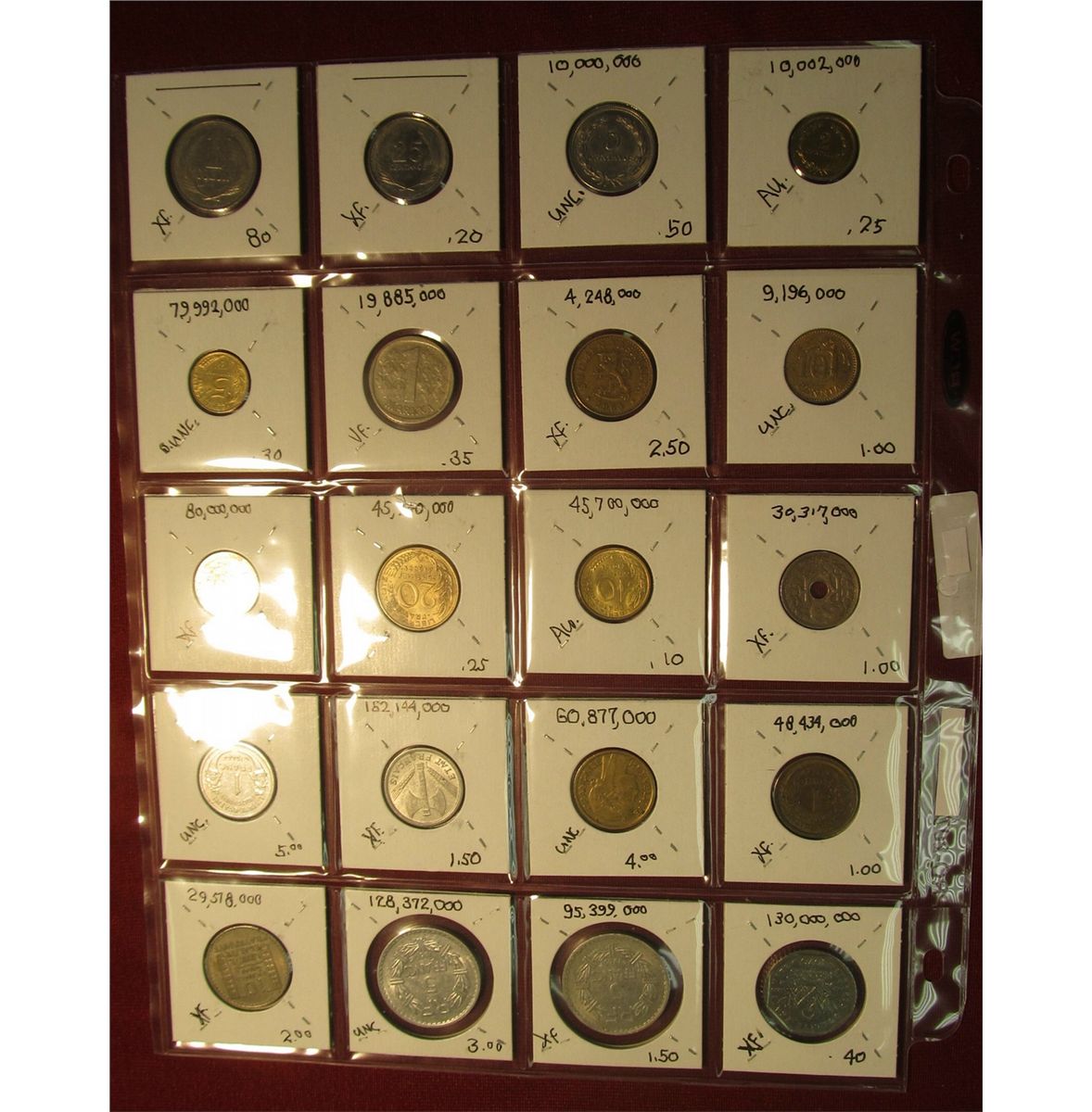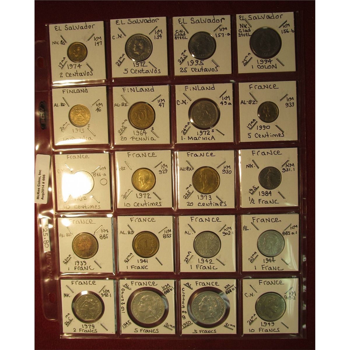 666. (20) World Coins in a plastic page. All identified and in 2" x 2" holders, includes El Salvador, Finland, & France. KM value $25.80.