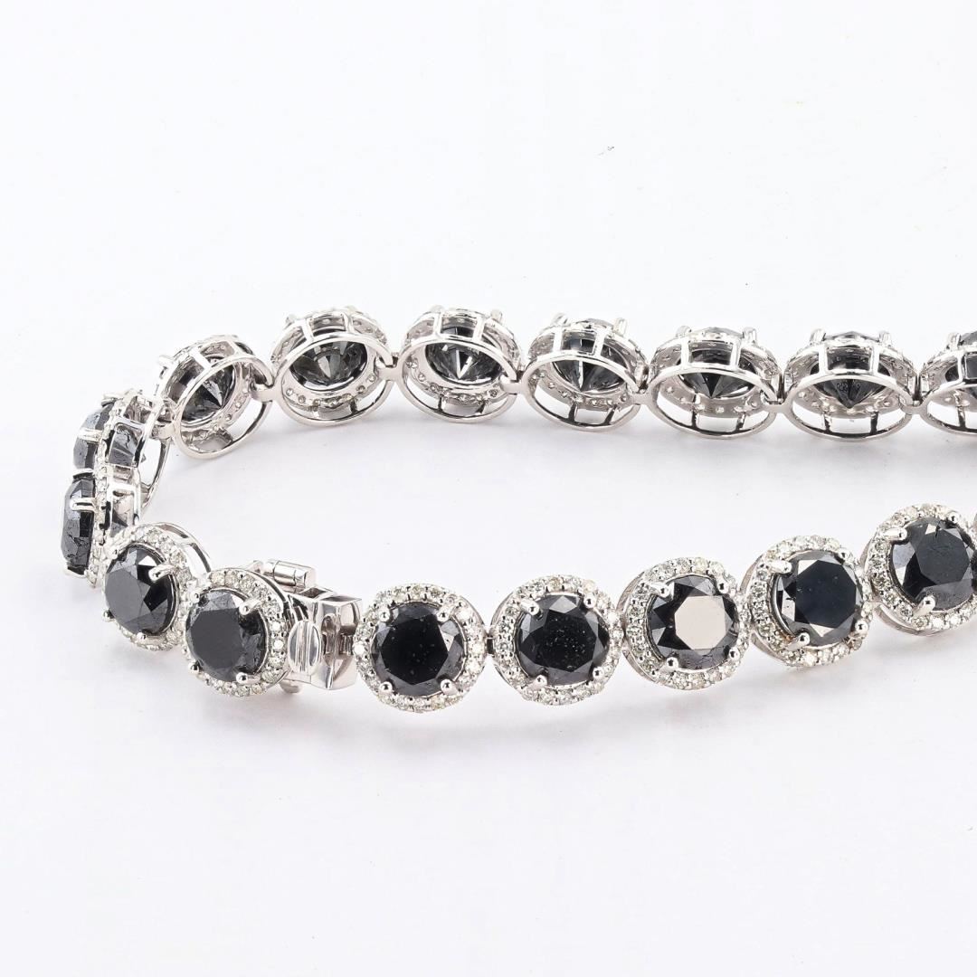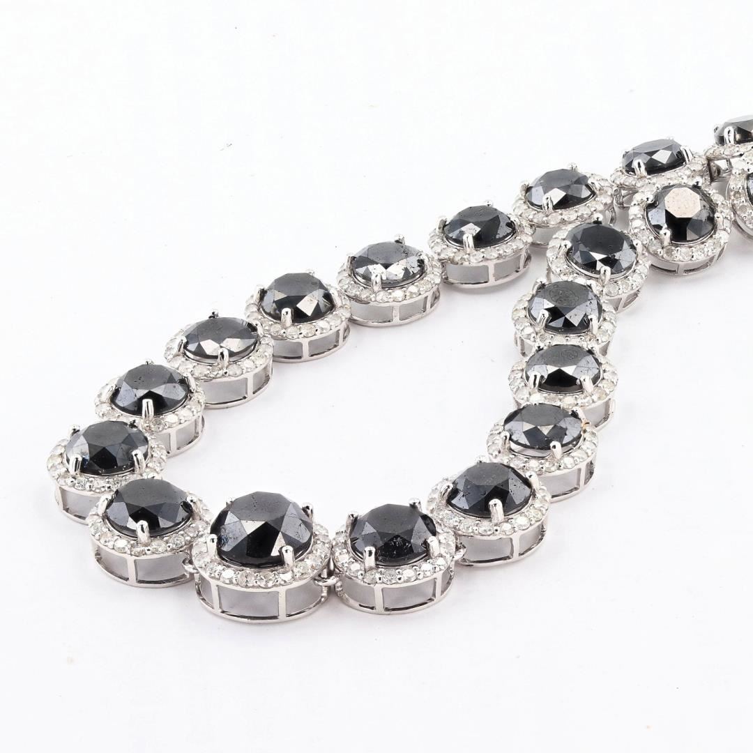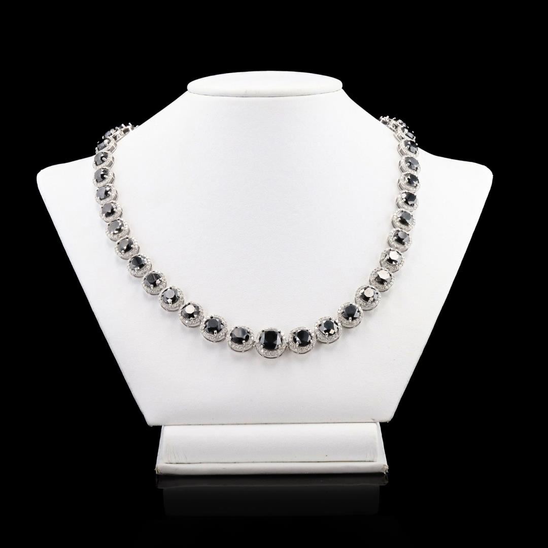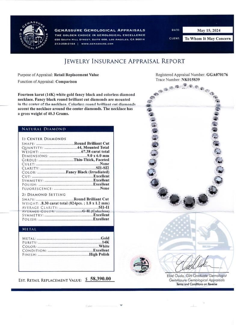 Fourteen karat (14K) white gold fancy black and colorless diamond necklace. Fancy black round brilliant cut diamonds are mounted in the center of the necklace. Colorless round brilliant cut diamonds accent the necklace around the center diamonds. The necklace has a gross weight of 40.3 Grams. #NATURAL DIAMOND# 1) CENTER DIAMONDS; SHAPE: Round Brilliant Cut; QUANTITY: 44, Mounted Total; WEIGHT: 67.38 carat total; DIMENSIONS: 9.0 x 6.0mm; GIRDLE: Thin-Thick, Faceted; CULET: None; CLARITY: SI1-SI2; COLOR: Fancy Black (Irradiated); CUT: Excellent; SYMMETRY: Excellent; POLISH: Excellent; FLUORESCENCE: None; 2) DIAMOND SETTING; SHAPE: Round Brilliant Cut; WEIGHT: 8.30 carat total (824pcs, 18 x 1.2mm); AVERAGE CLARITY: SI1-I1; AVERAGE COLOR: G-H (Colorless); SYMMETRY: Excellent; POLISH: Excellent #METAL# METAL: Gold; PURITY: 14K; COLOR: White; CONDITION: Excellent; FINISH: High Polish #Size: 17