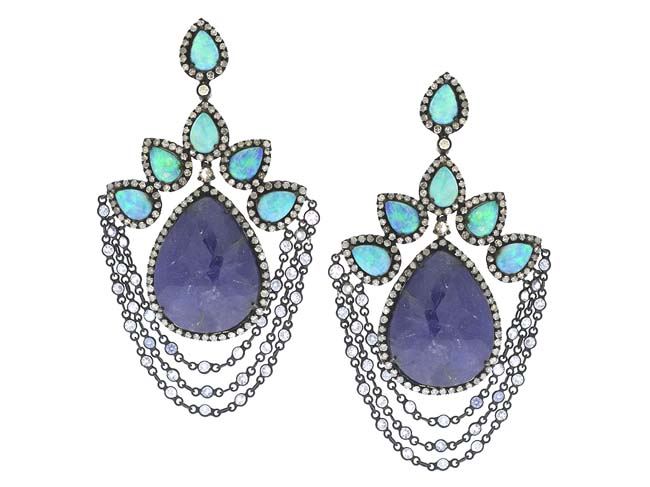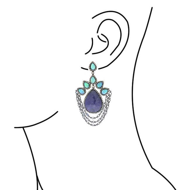 Opal DOUBLET, Tanzanite AND DIAMOND EARRING/Diamond Count 1:/Diamond 1 TCW:3.7/Diamond Color & Clarity:J-L/I1-I2/Diamond Count 2:/Diamond 2 TCW:/Diamond Count 3:/Diamond 3 TCW:/Diamond Color & Clarity:/Gemstone Count 1: 12/Gemstone 1 TCW:64.09/Gemstone Type:Opal/Gemstone Count 2: 2/Gemstone 2 TCW:/Gemstone Type:Tanzanite/Gemstone Count 3: /Gemstone 3 TCW:/Gemstone Type:/Metal 1:18k GoldYellow Gold/Gram Weight:2.52over0.925 SilverSterling Silver /Weight/gram:14.4/Gross Weight:30.33/Item-Size (HxW mm):