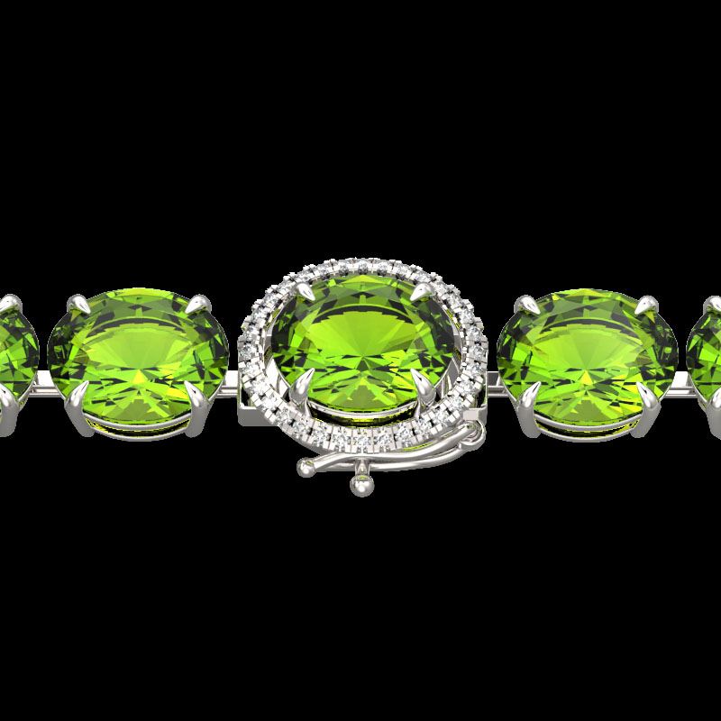REF-428Y8K -22270 ---- 67 CTW Peridot & Micro VS/SI Diamond Halo Designer Bracelet 14K White Gold ---- Luxury Designer Brand Bracelet Appraised at $30,650 Certificate Number US22270 14k White gold, Bracelet Size is 7 1/2 Inches, Bracelet measuring approx. 8 mm x 7 1/2 inches, weighing in total approx. 20 grams. Made in the USA and is stamped 14k, Main stone 66.75 carat total weight containing 20 pieces of Intense Green color with AAA quality Oval shape cut Peridot , Stone #2 0.25 carat total weight containing 32 pieces of H-I color with VS/SI quality Round shape cut Diamond