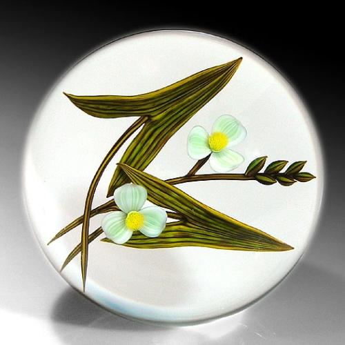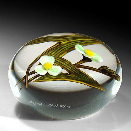 Chris Buzzini 1998 "Arrowhead" paperweight, containing a plant with two yellow-centered white flowers, buds, and arrowhead-shaped dark green leaves, over clear ground. Signed/dated. Limited edition #5 of 25. Diameter 3 1/4". NO RESERVE