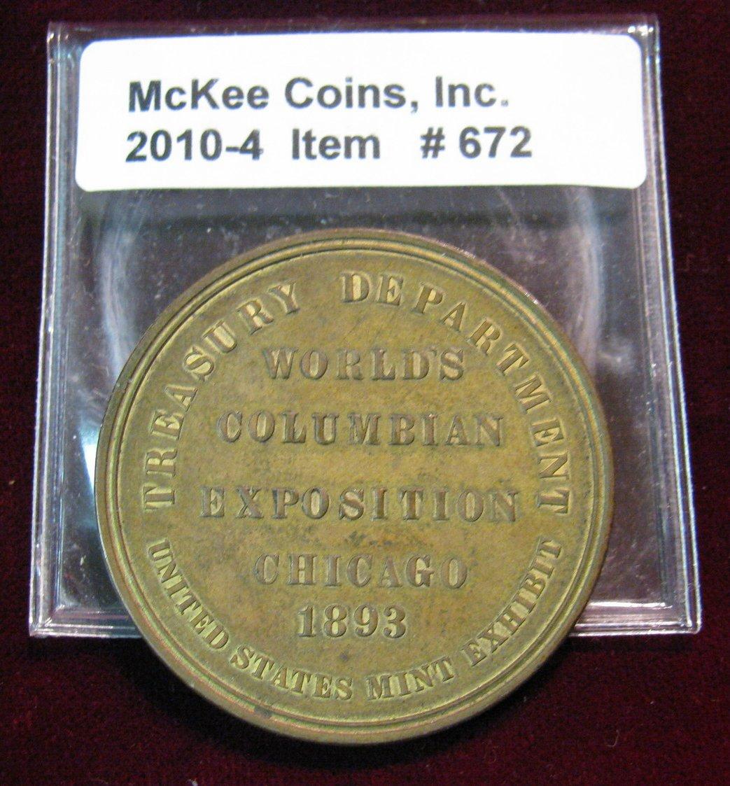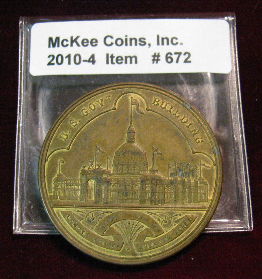 672. 1893 So-called Dollar. "Treasury Department/United States Mint Exhibit/World's/Columbian/Exposition/Chicago/1893", "U.S. Gov Building". Bronze. 38mm. EF.