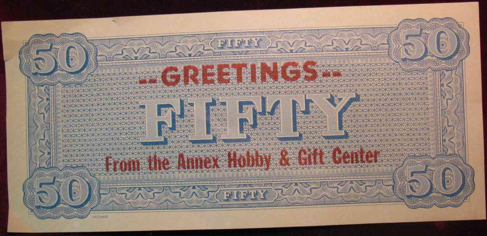 673. $50 Confederate States of America Advertising note. Printed on a facsimile. "Greetings from the Annex Hobby & Gift Center".