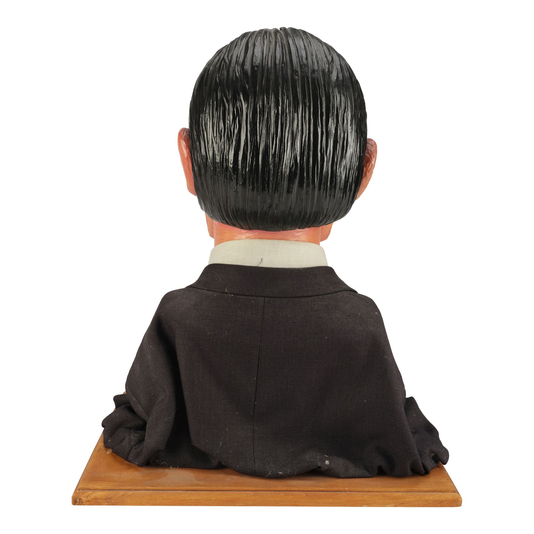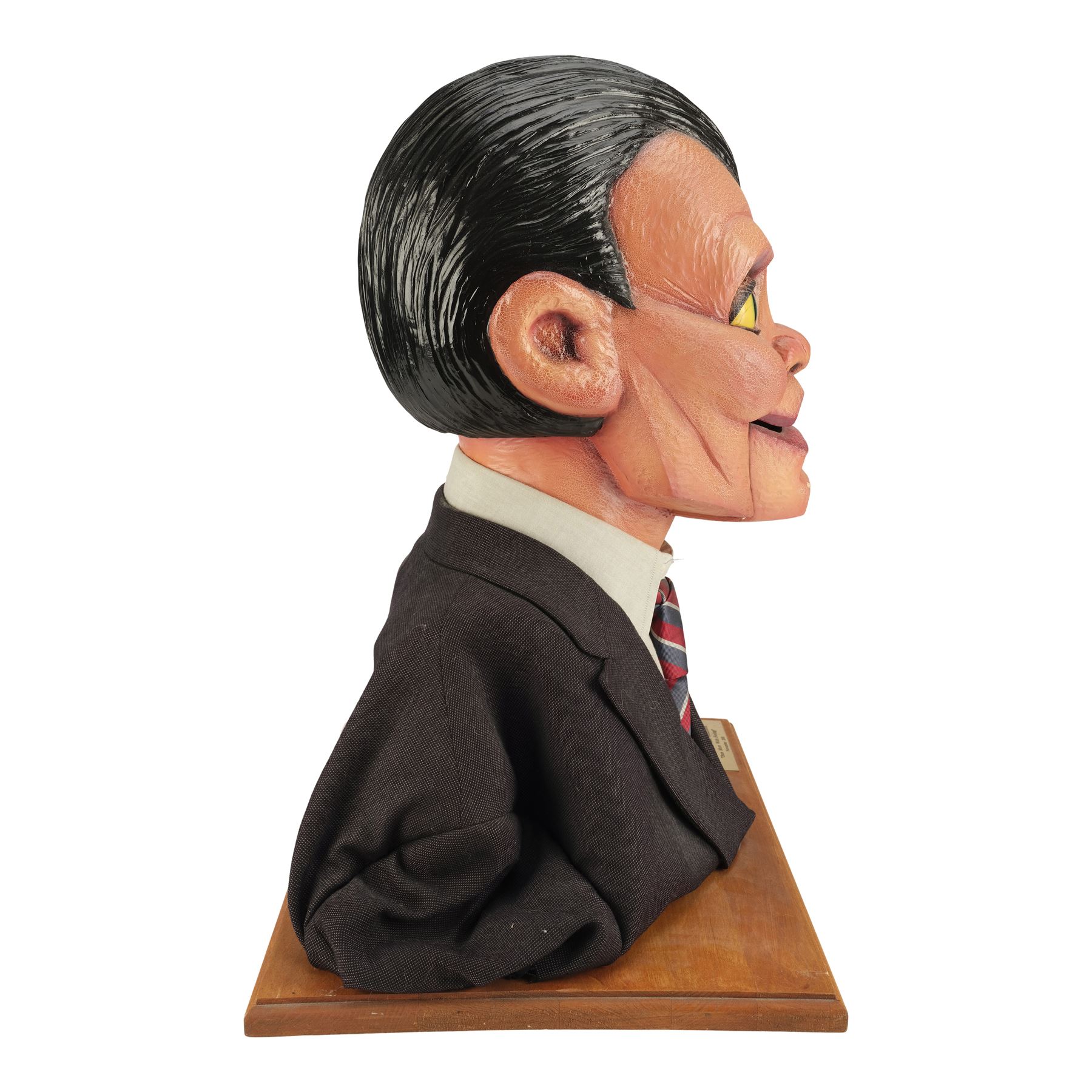This lot consists of one hollow resin bust dressed in the upper half of a gray suit with a red, white, and navy tie and one poster with art by Adam Hughes. The bust comes on a wooden display base with a metal plaque inscribed "To GARETH, With Appreciation, from Harlow FX." The poster features the initial air date for the episode, "Tuesday November 6th 8PM" and the characters Buffy (Sarah Michelle Gellar), Xander (Nicholas Brendon), Willow (Alyson Hannigan), Dawn (Michelle Trachtenberg) and the demon Sweet (Hinton Battle). This lot exhibits creasing from being rolled, chipping on the bust, cracked paint, and a buildup of grime in the crevices. Dimensions: (largest) 16.5" x 12.5" x 21" (42 cm x 31.75 cm x 53.25 cm)