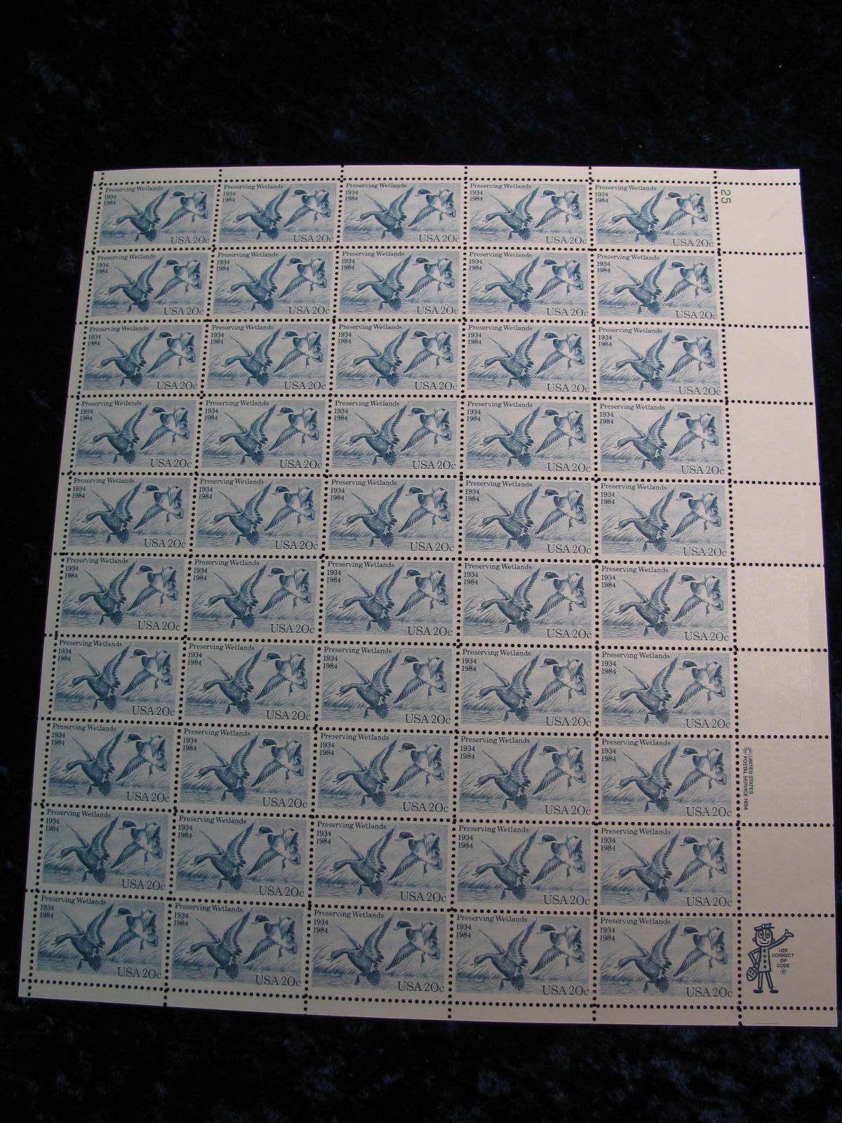 679. Mint Sheet of .20c U.S.A. Duck Stamps. "Preserving Wetlands". 50 Stamps. ($10.00 face value)
