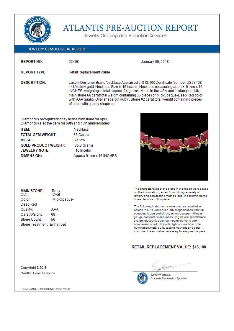 REF-234H9A -23408 ---- 68 CTW Ruby Eternity Designer Inspired Tennis Necklace 14K Yellow Gold ---- Luxury Designer Brand Necklace Appraised at $18,100 Certificate Number US23408 14k Yellow gold, Necklace Size is 16 Incehs, Necklace measuring approx. 9 mm x 16 INCHES, weighing in total approx. 24 grams. Made in the USA and is stamped 14k, Main stone 68 carat total weight containing 56 pieces of Mid-Opaque-Deep Red color with AAA quality Oval shape cut Ruby , Stone #2 carat total weight containing pieces of color with quality shape cut